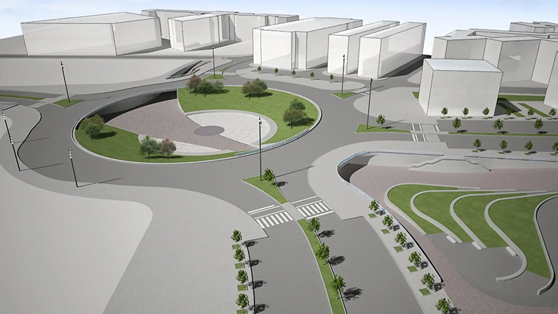 It consists of 15 km of roads. Traffic is concentrated on the perimeter roads (the main routes are Juan Pablo II and Cataluña), with the interior roads being for pedestrian and vehicle coexistence. There are also 2 km of bicycle lanes. Several structures have been built, including the Mendillorri access bridge (60 m span in three sections), the bridge over the river Sadar in Avda. de Zaragoza (double bridge with a 20 m span) and the three structures of the raised roundabout in the Gran Plaza.
