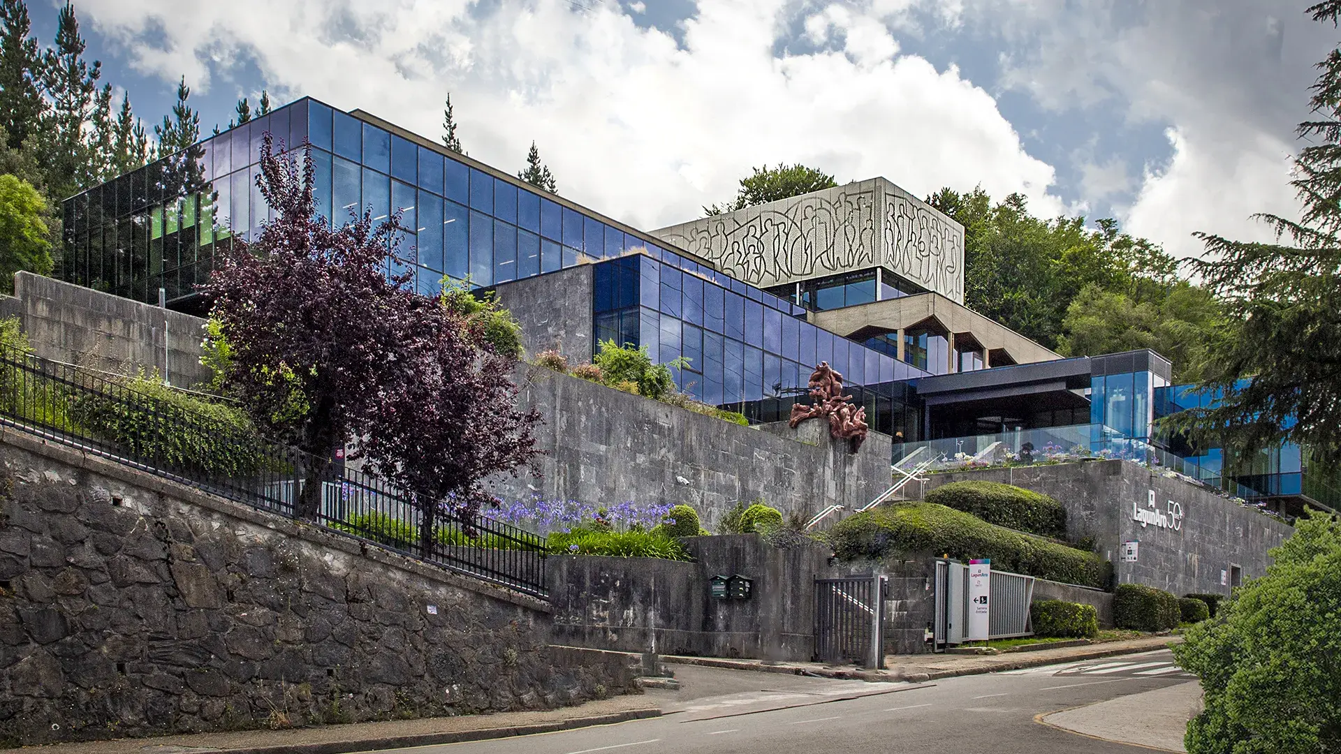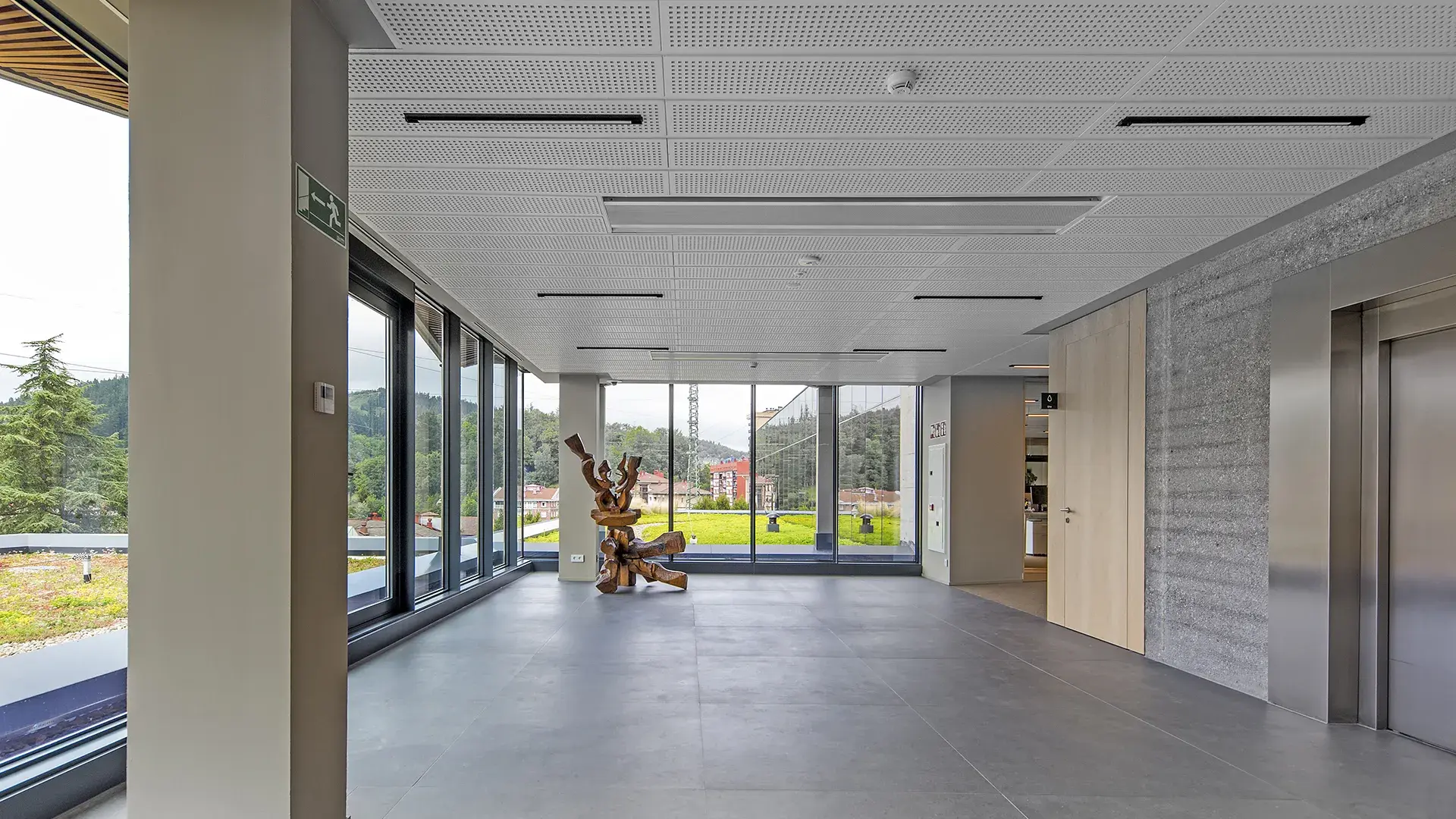 The building is a complex of glazed parallelepipeds resting on a stone base set into the Olandixo hillside. The curtain wall brings natural light into the offices and transmits coherence with LagunAro's values of transparency in management. Large glass enclosures allow the green roofs of the building to be enjoyed from inside the offices.