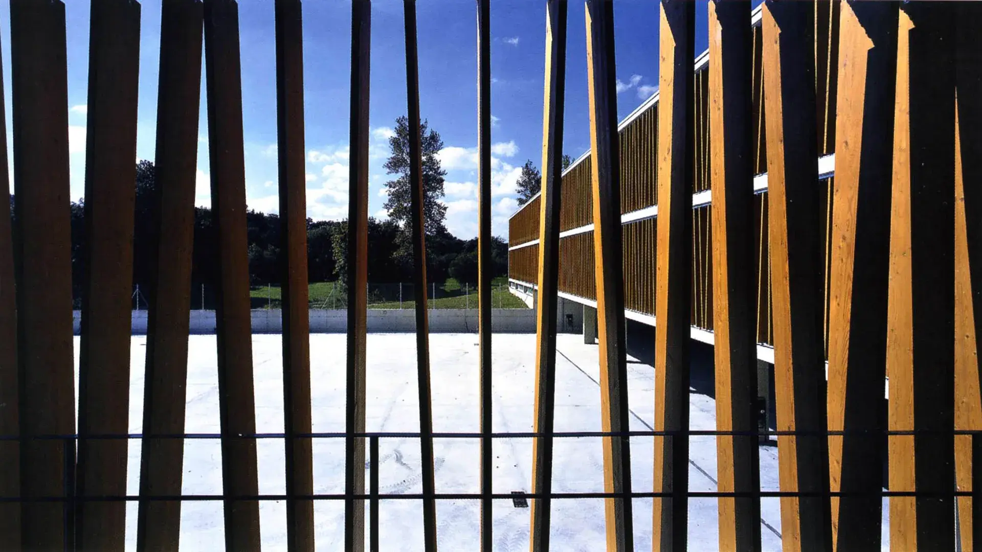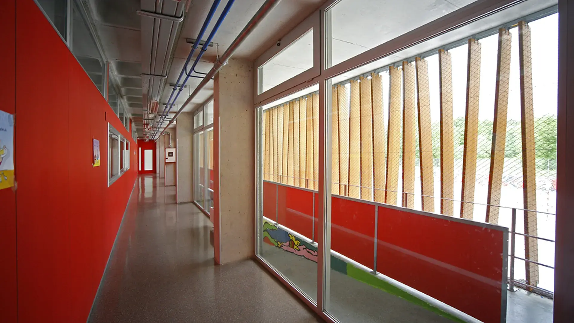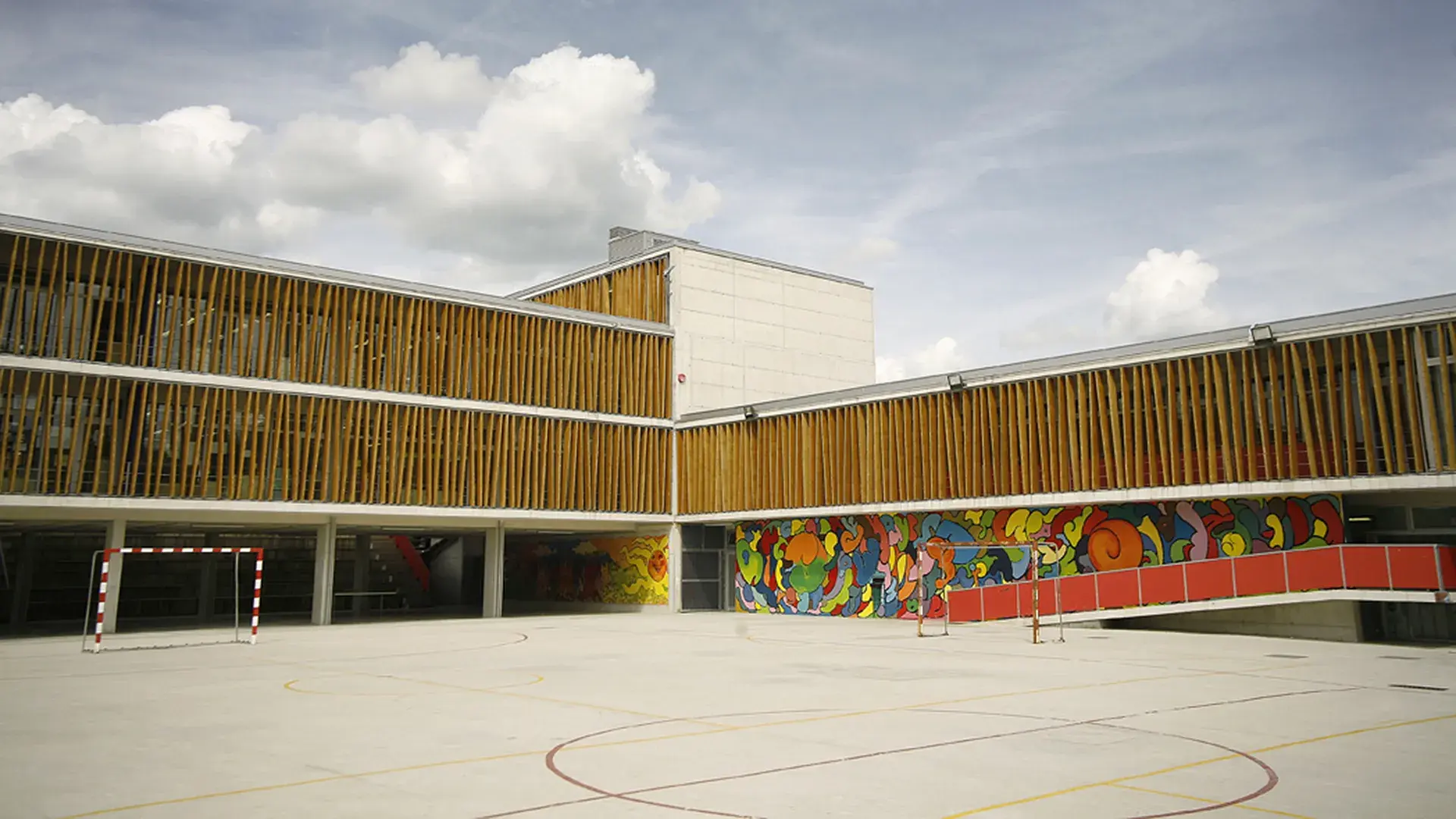 The building is designed as two rectangular prisms, perpendicular to each other, forming a tilted "T" that creates two courtyards, one upper and sheltered, which is used as a garden and recreation area for children from 0 to 3 years old, and the other, lower and open to the valley, for use as the school playground.