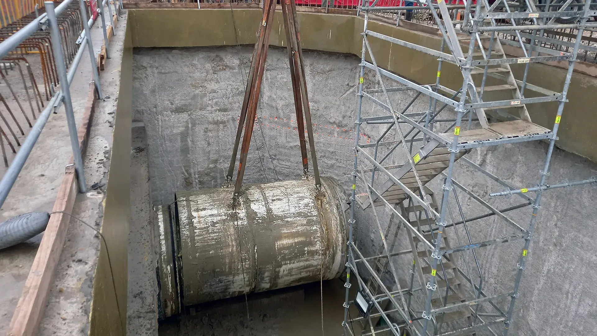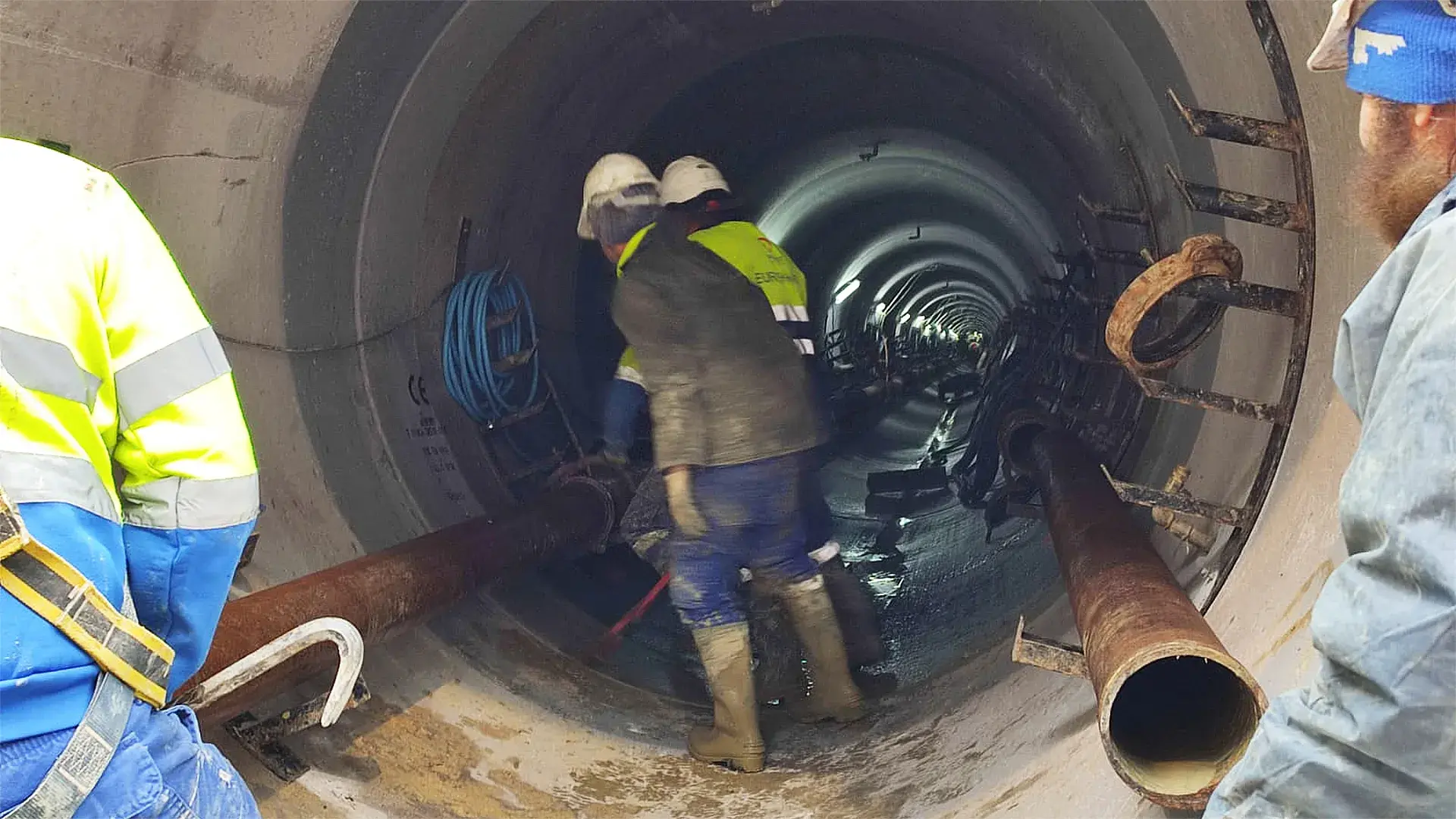 The collector crosses the railway platform of line 9 of Metro de Madrid, between the Puerta de Arganda and Rivas Urbanizaciones stations. For the aforementioned crossing, two parallel conduits, each 91.2 m long, were driven, each made of concrete pipe with an internal diameter of 2,500 mm. The driving method was carried out by means of a tunnel boring machine with a closed shield of the hydro-shield type. This technique consists of full-section drilling by means of thrust and cut by rotation in which both the guidance and thrust are managed from a control cabin.