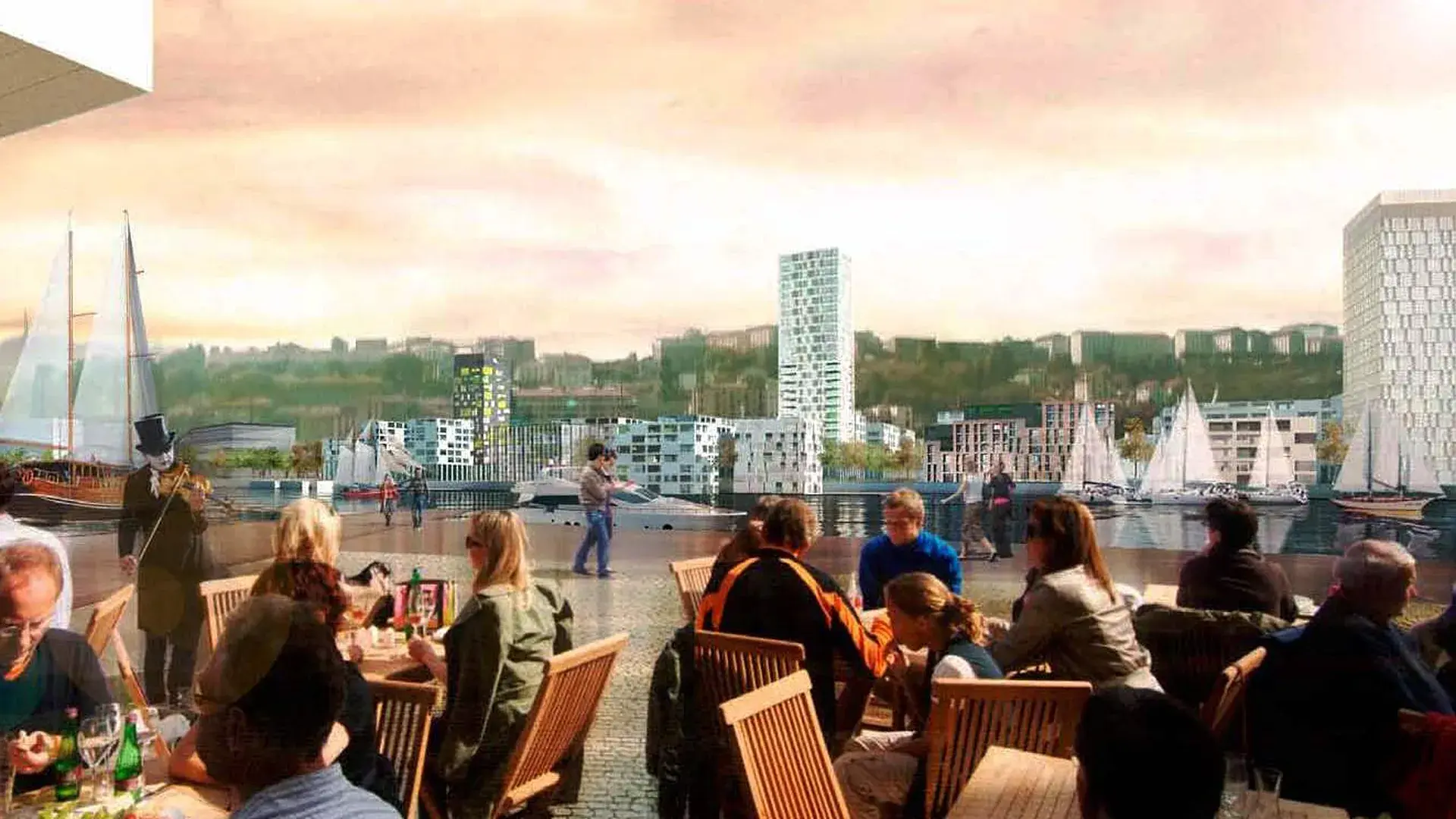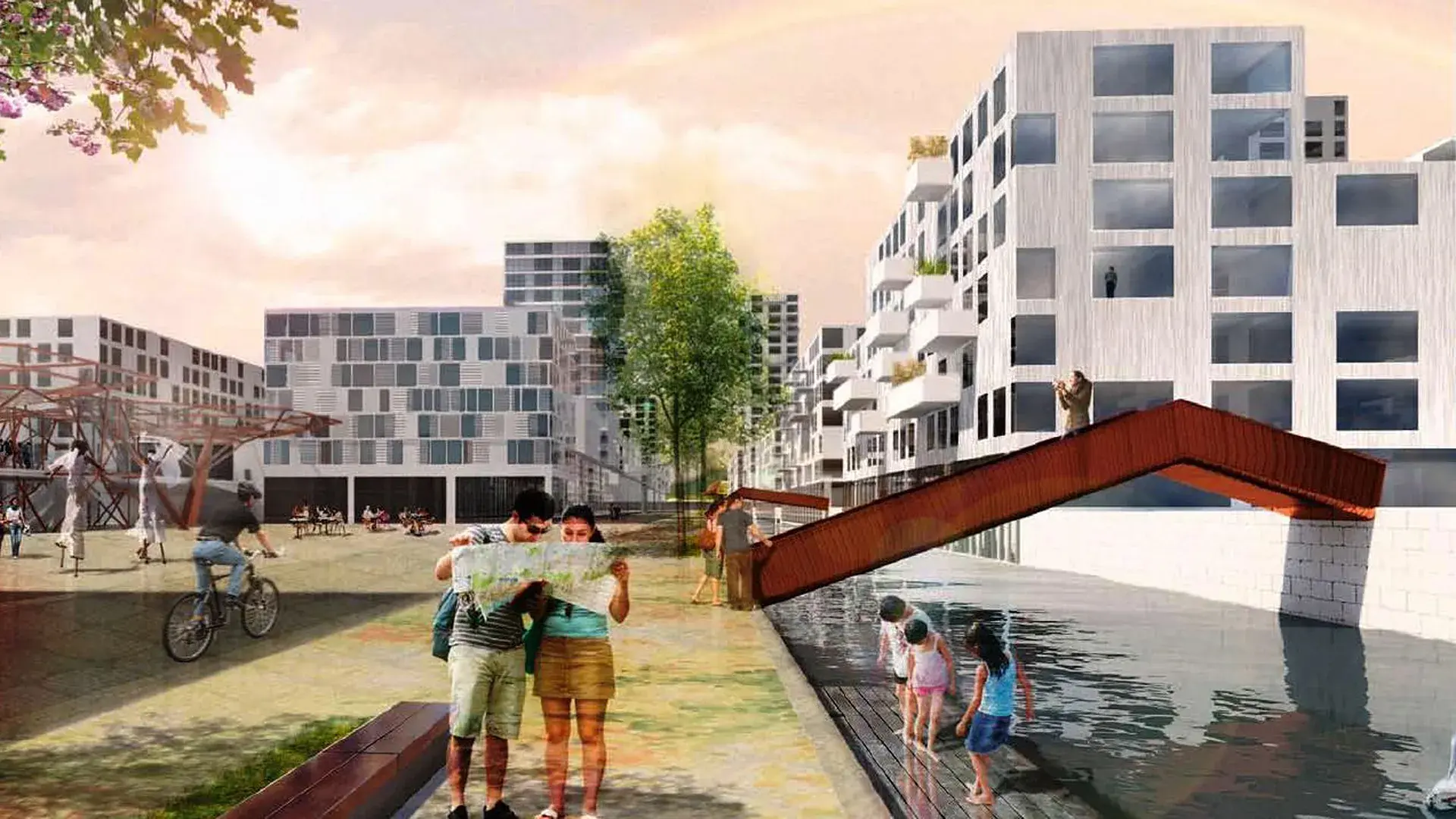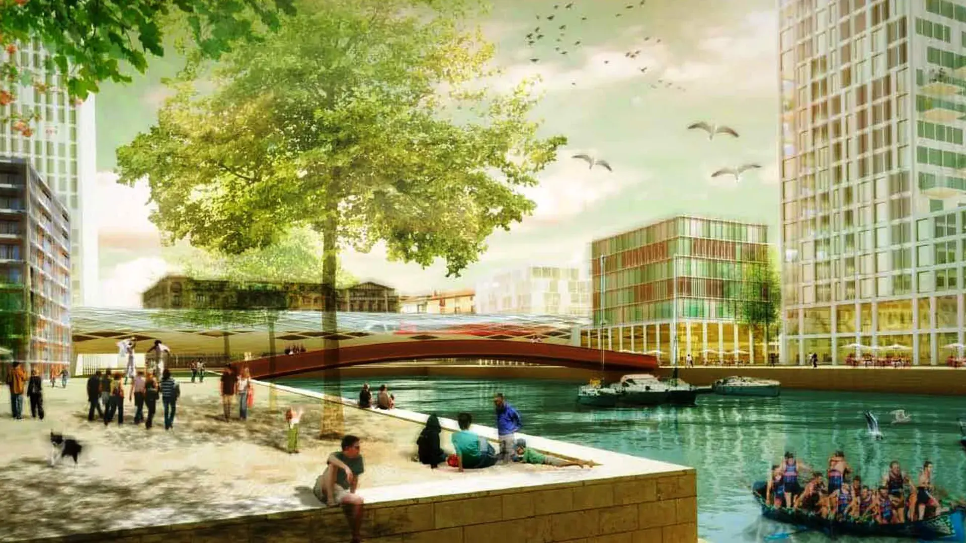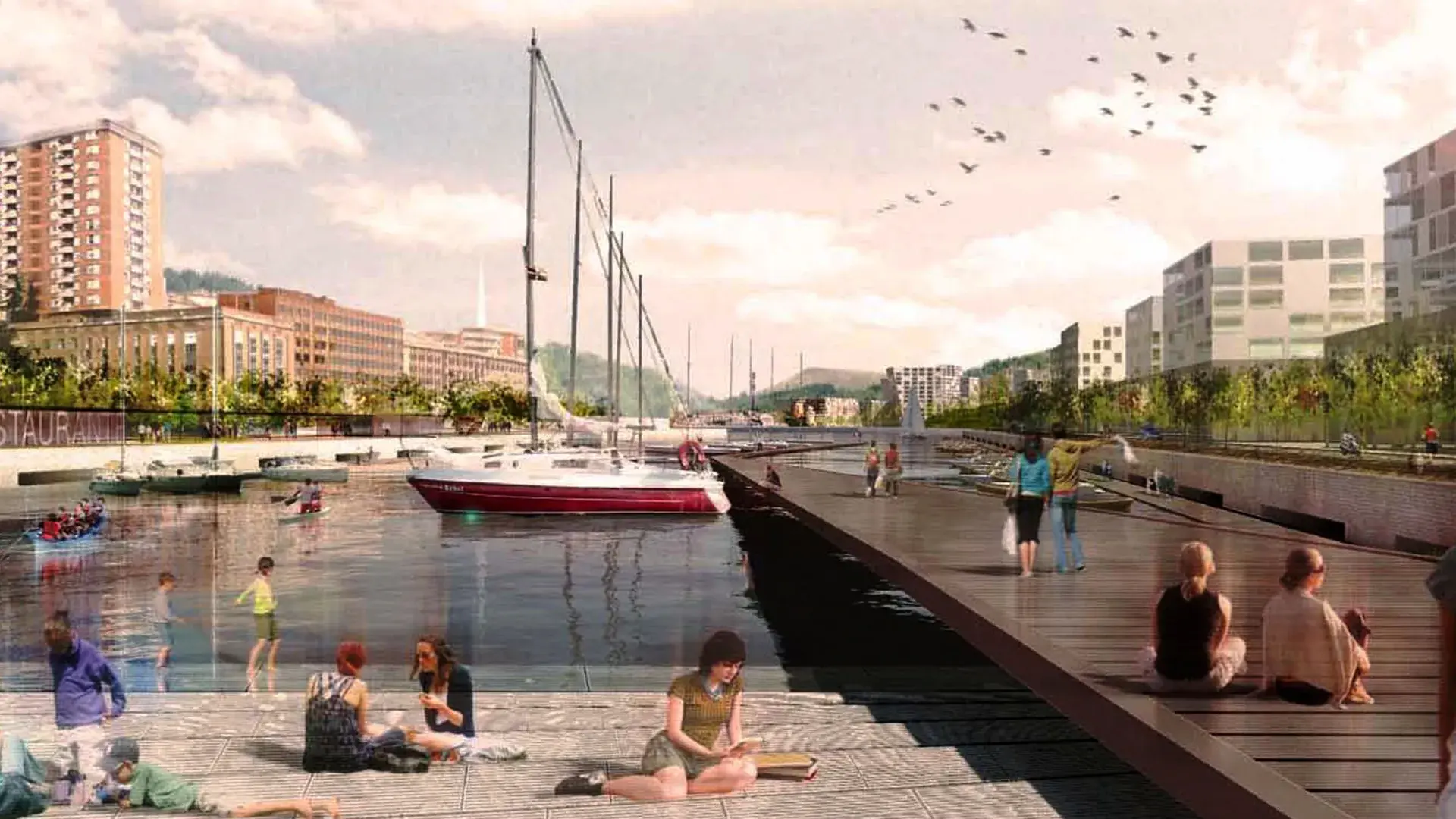 The proposal aims to recover the port space for the configuration of a new urban space that links the fabric of the municipalities affected around the stretch of water. A mixture of residential and commercial uses, economic activities and amenities is proposed, with a high building density (+ 800,000 m2t for lucrative purposes). One of the most important features is the opening of the stretch of water for public use, with a 6.5 km promenade, new public spaces and leisure and sporting uses on the water's surface. The public transport system is based on the existing railways, with internal bus and motor shuttles.