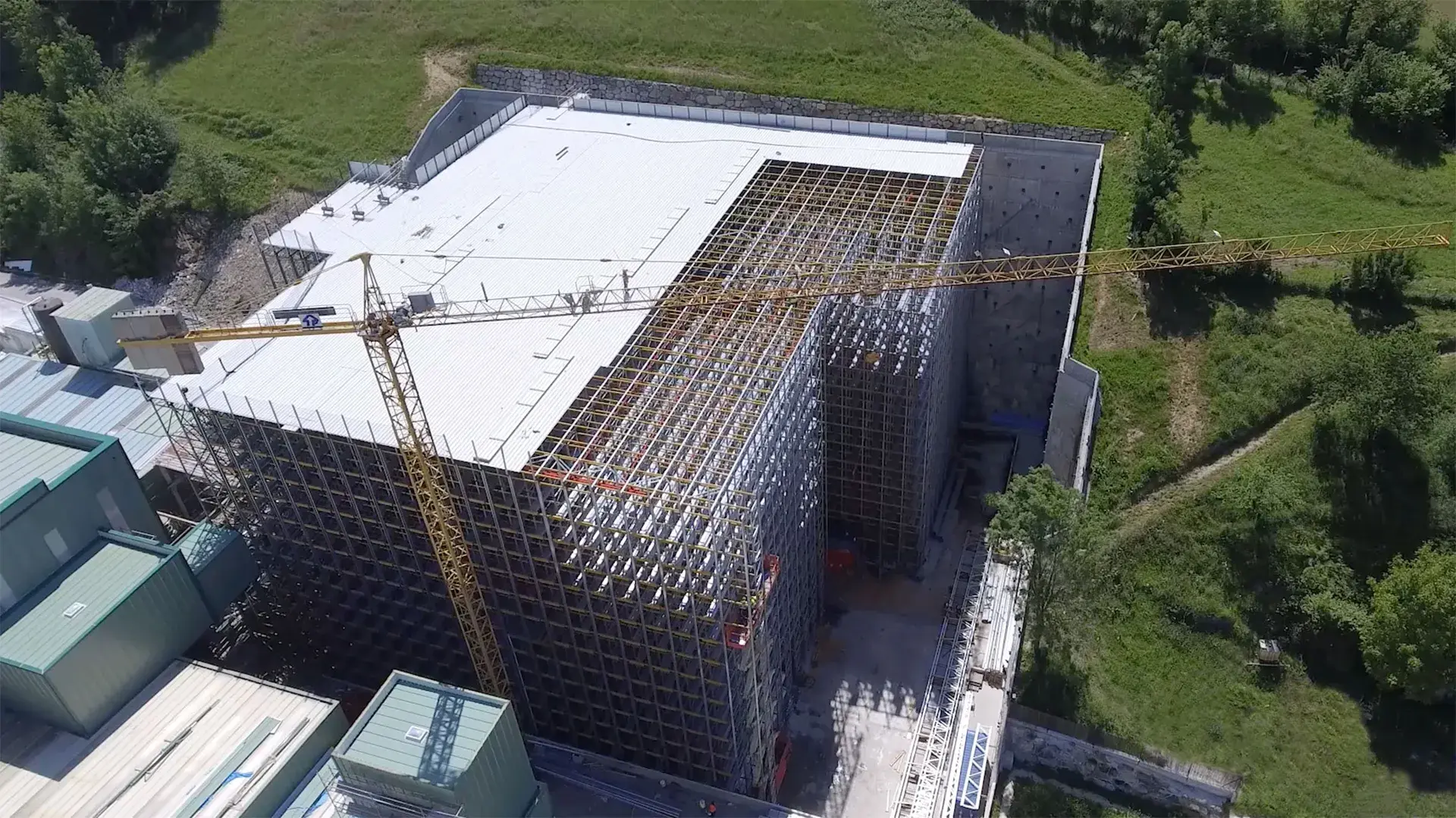 After this success, the construction of the building to house the new machine was only the first phase of the project. Shortly afterwards, in 2019, once the urban planning procedures were completed, the construction and commissioning of an automated warehouse began, which required a significant prior investment in excavation and anchored walls to prepare the land, given the difficult orography of the site and the need to care for the impact of a tall building such as this in its magnificent natural surroundings. The manufacture of this product directly involves the use of a raw material and the generation of a finished product with a large volume and very little weight, which requires a considerable increase in the storage capacity of the plant, both for raw material and finished product.