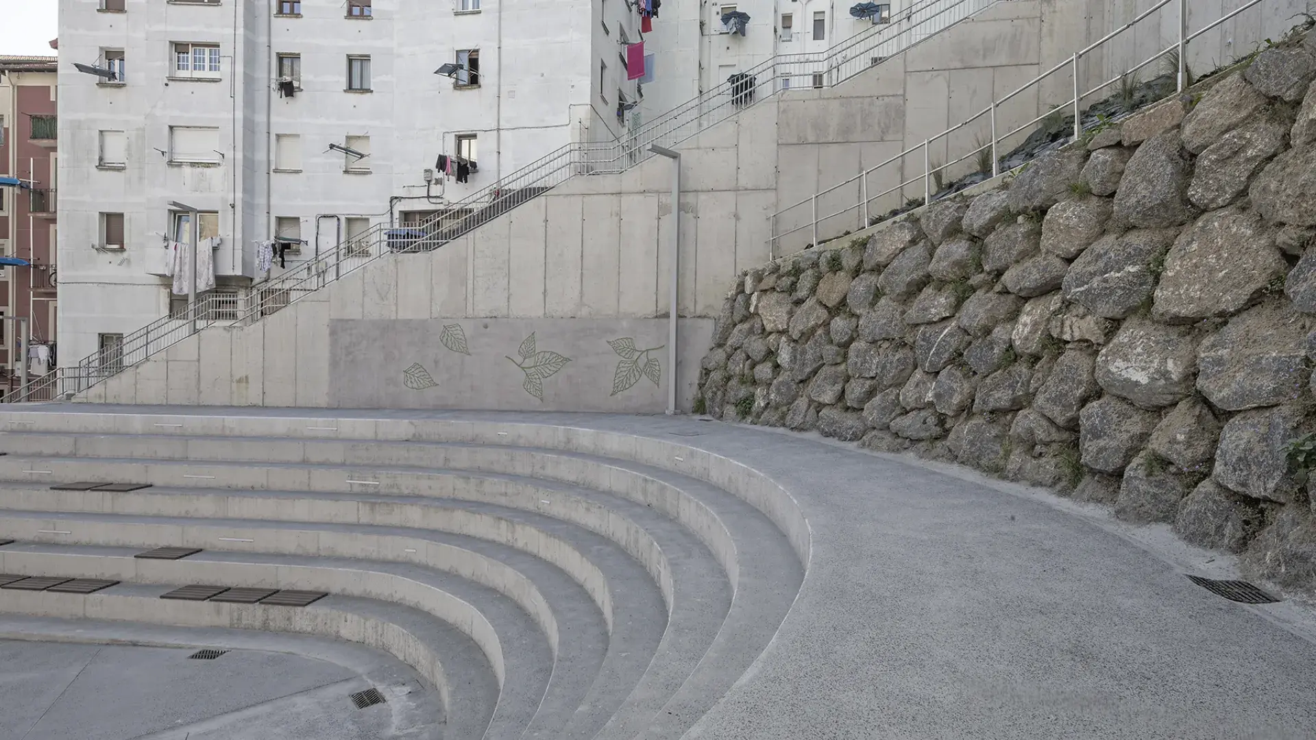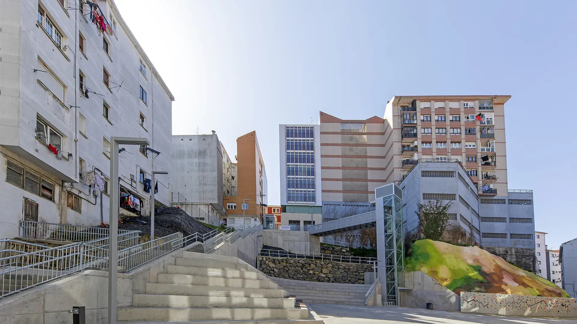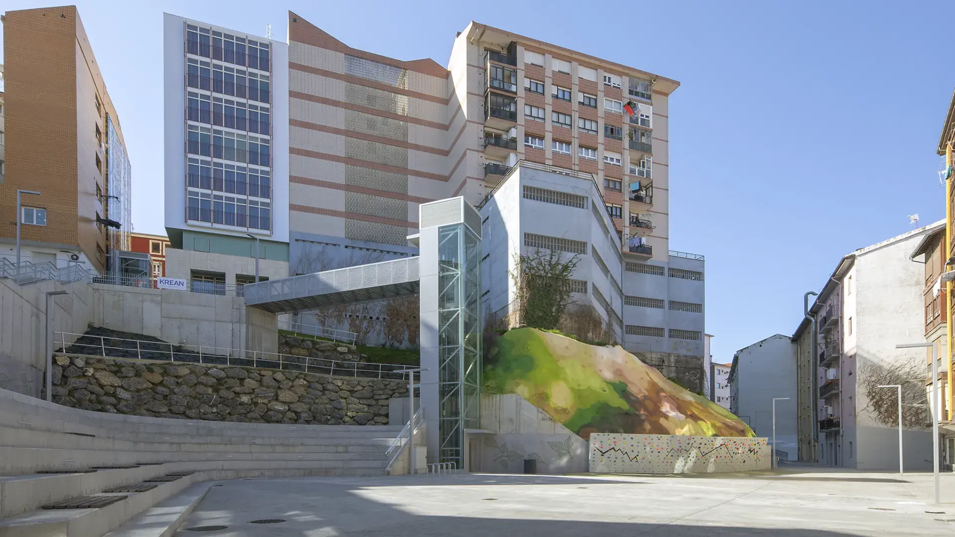 The latest work has consisted of the execution of the last two phases of UE1 of the ARI Txabarri-El Sol, and are the culmination of a long process of work on an urban regeneration project in which, faced with the possibility that the space created would become a marginal area, the aim has been to create a space that helps to strengthen social ties and a sense of belonging to the neighbourhood. In addition, the aim has been to avoid competing with other urban spaces in the area, with teenagers in mind as potential users. A bouldering wall and bleachers have been built in the square to allow for outdoor activities, with open Wi-Fi, and a space dedicated to neighbourhood activities that also has outdoor space in the square itself. The space also allows for the possibility of opening terraces to the bars and cafes located there.