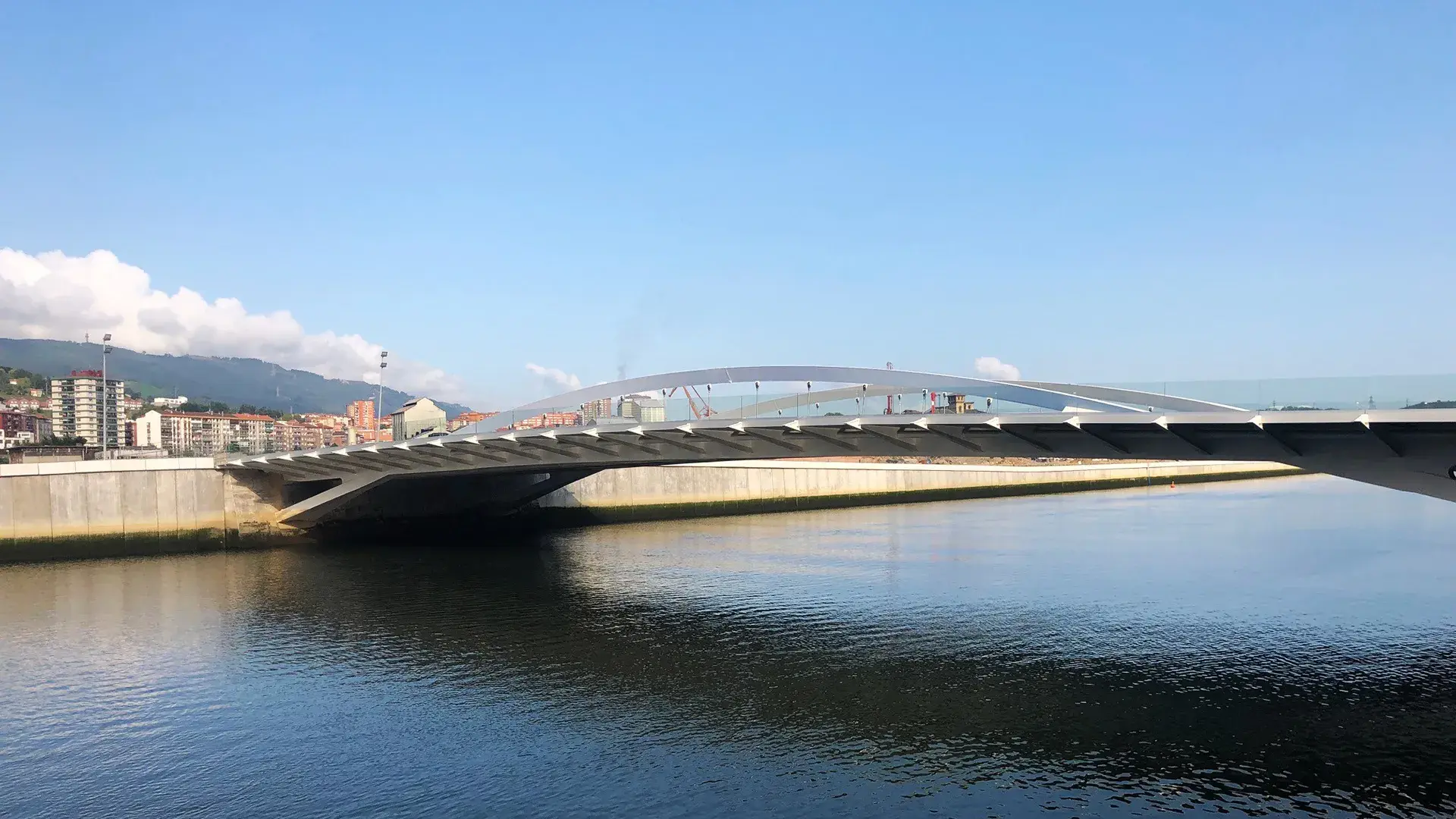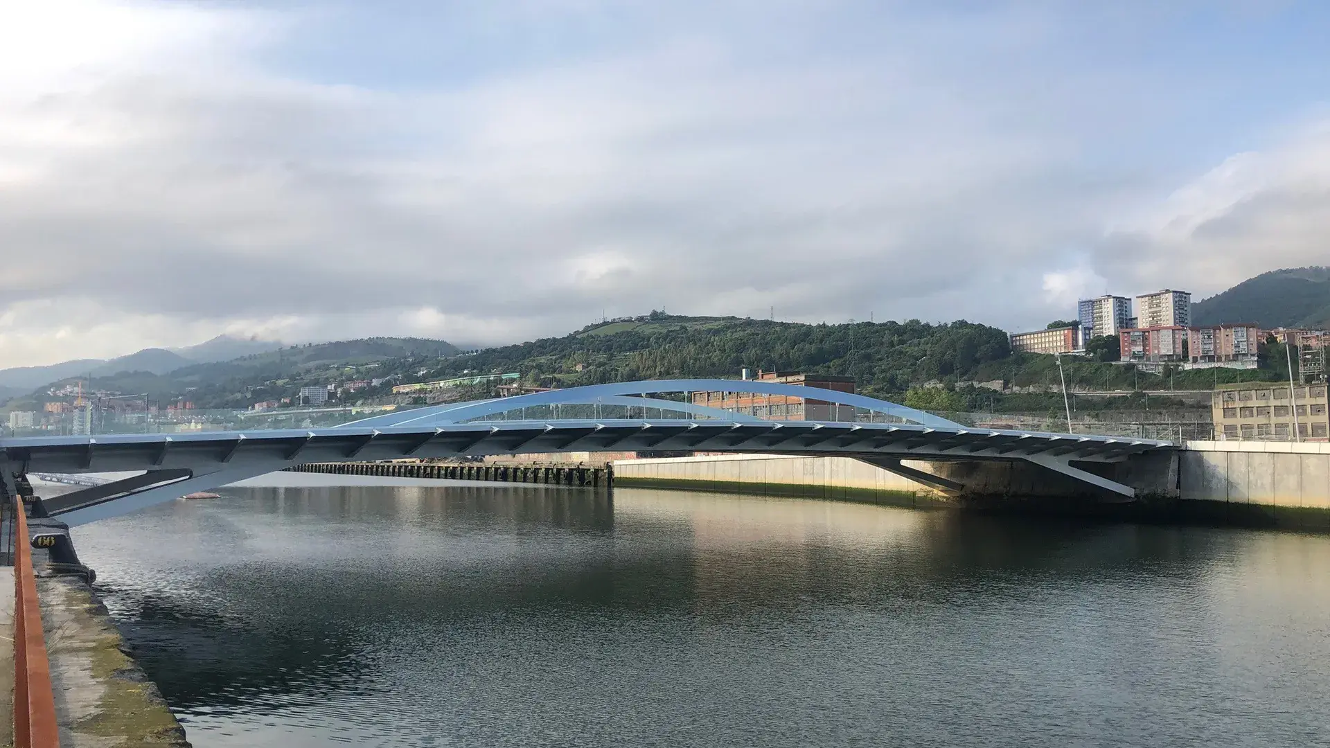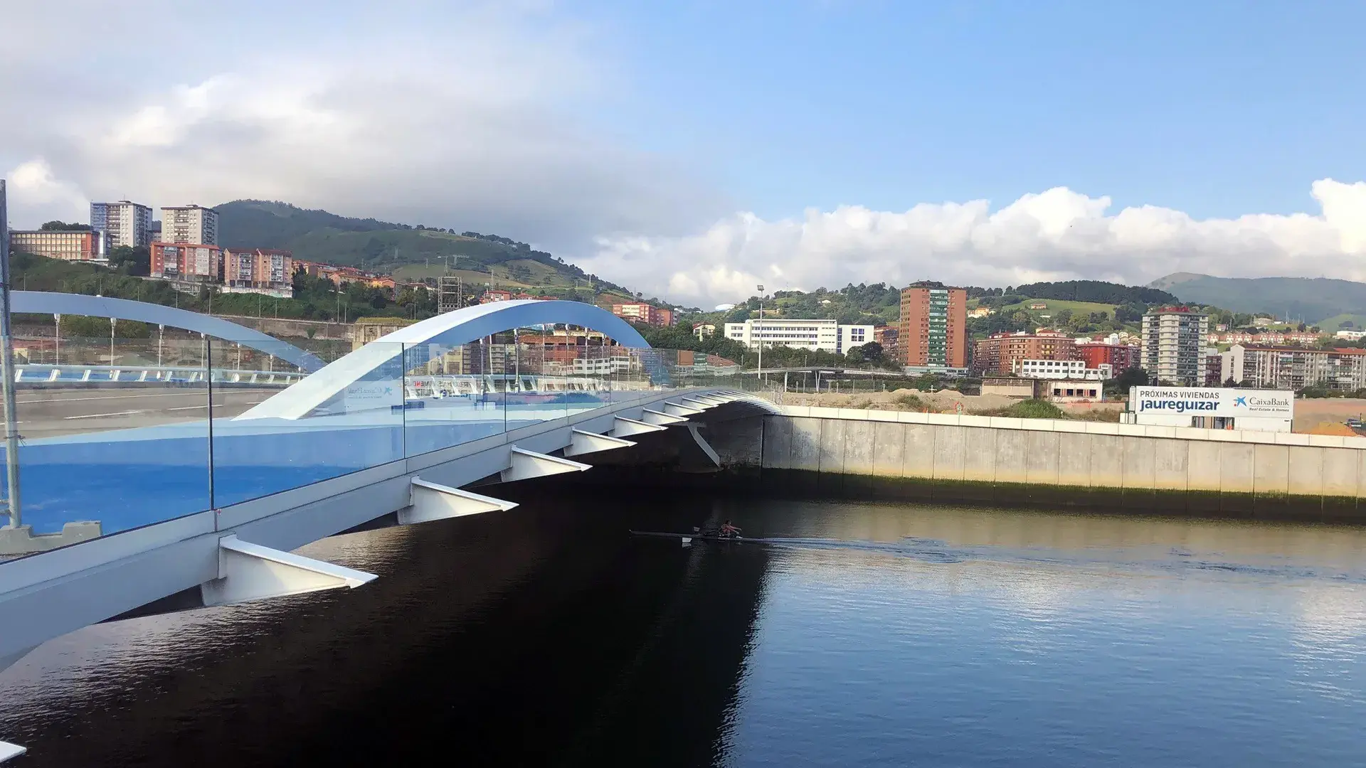 The bridge connects the San Ignacio district with Zorrotzaurre Island, crossing the Deusto canal and providing continuity to Calle Islas Baleares (right bank).