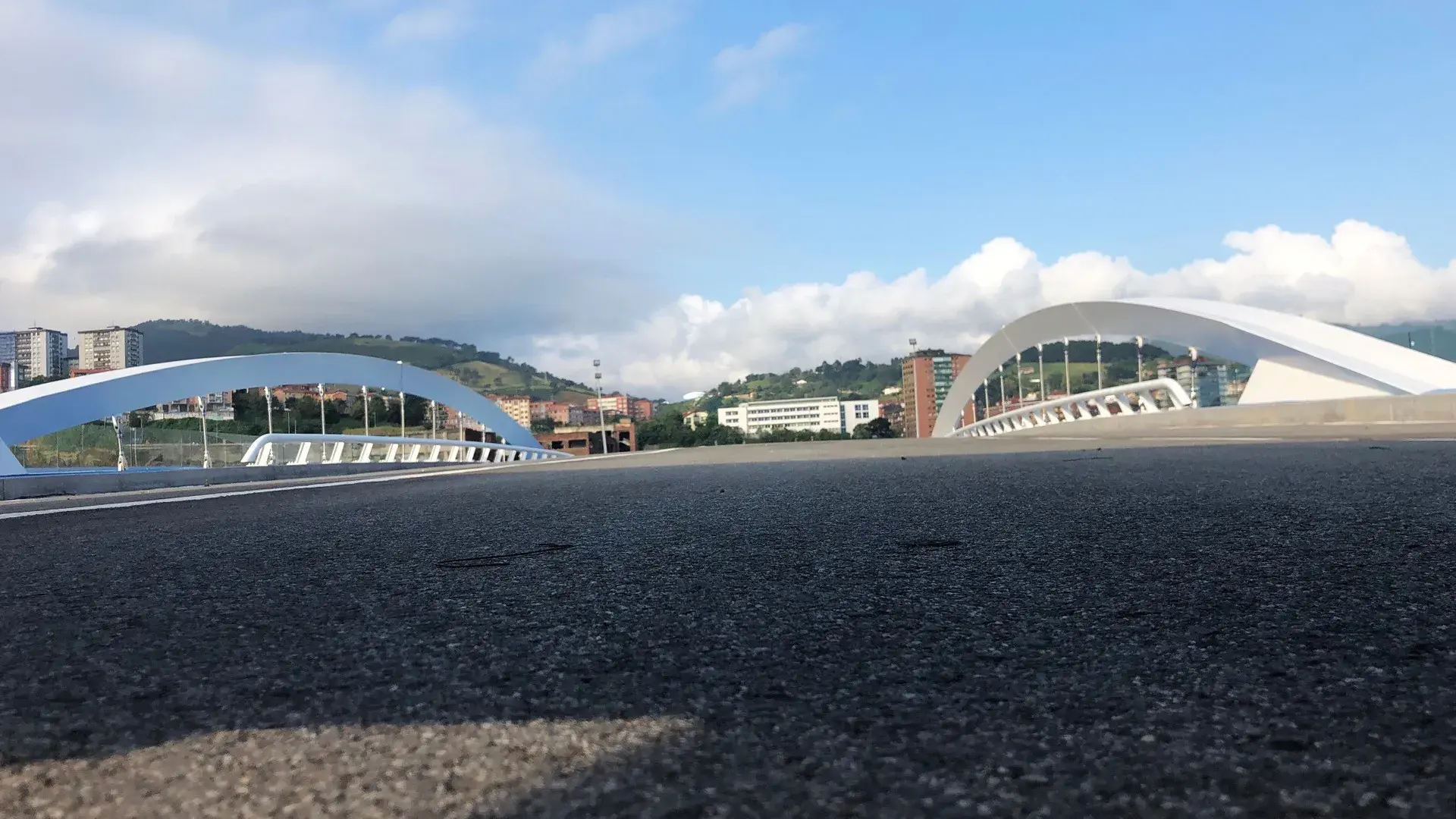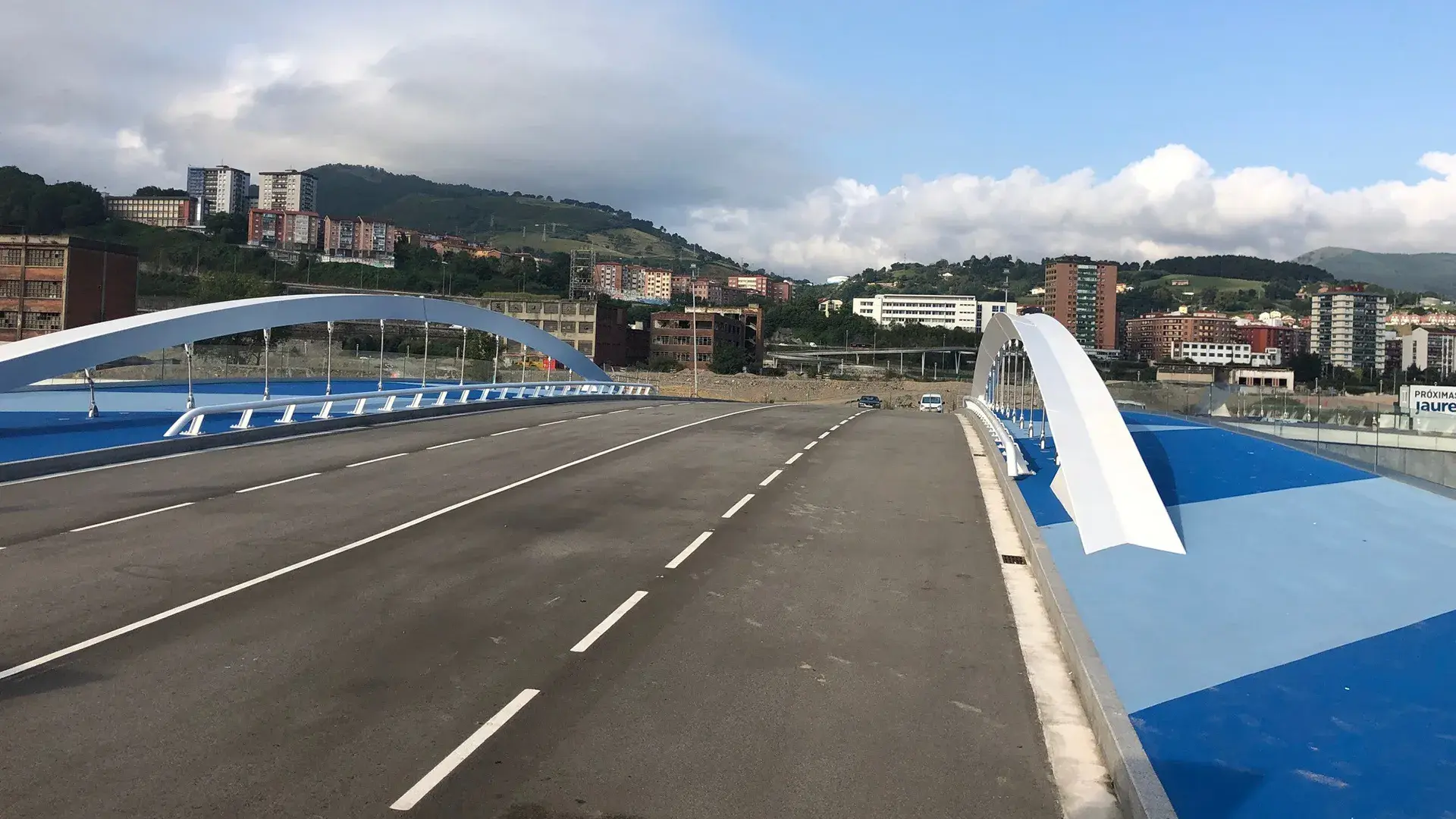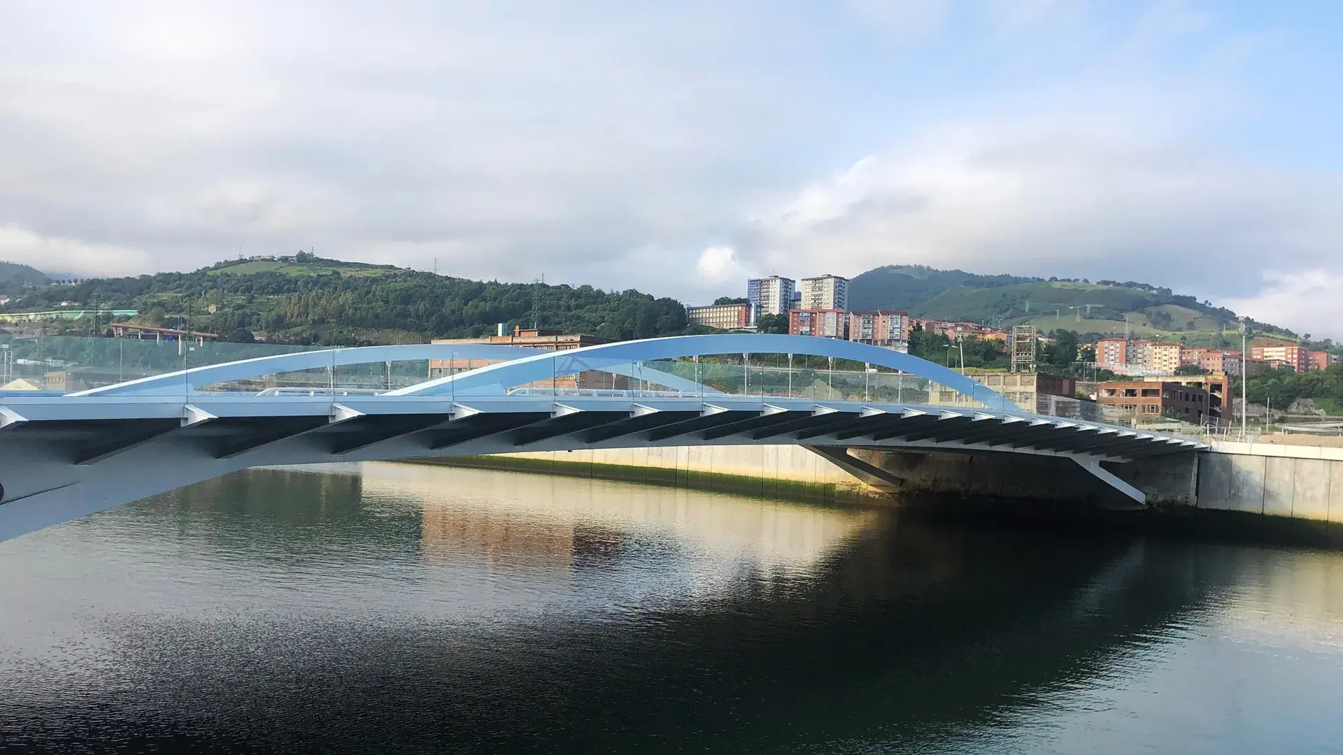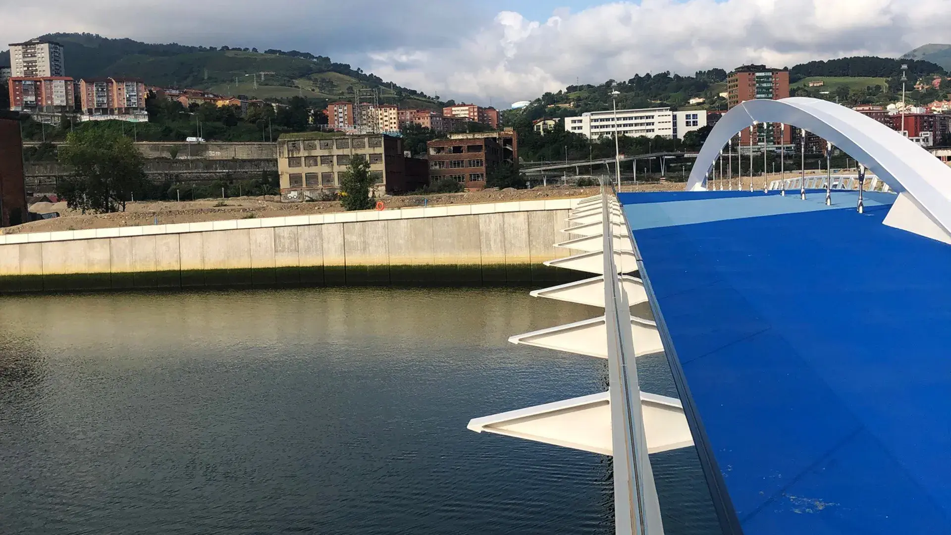 The bridge connects the San Ignacio district with Zorrotzaurre Island, crossing the Deusto canal and providing continuity to Calle Islas Baleares (right bank).