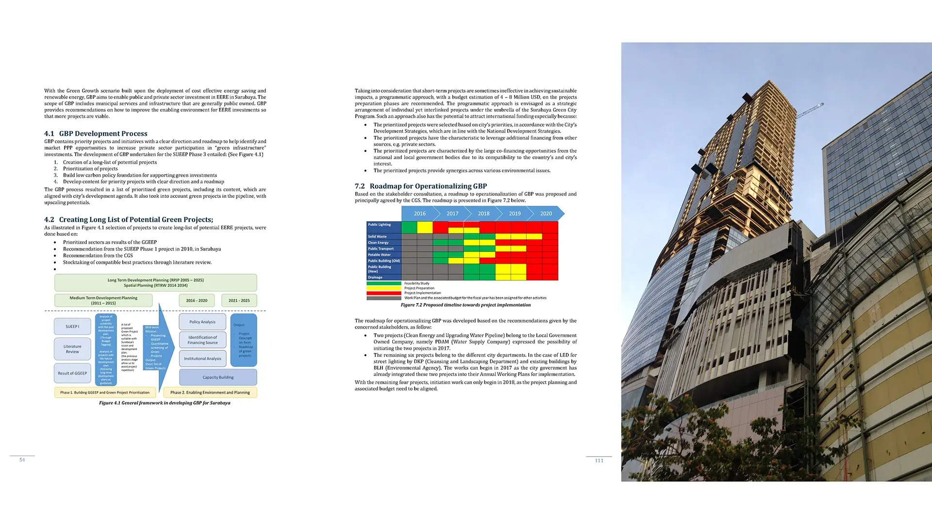 The aim of the project is to provide technical assistance and create institutional capacity to enable the City Government of Surabaya (CGS) to develop its Urban Sustainable Energy and Emissions Plan and a roadmap to meet its growing energy challenges. The objective is to assist the World Bank, together with the Mayor's Office of Surabaya, to prepare its own Green Growth Plan which is divided into two parts: