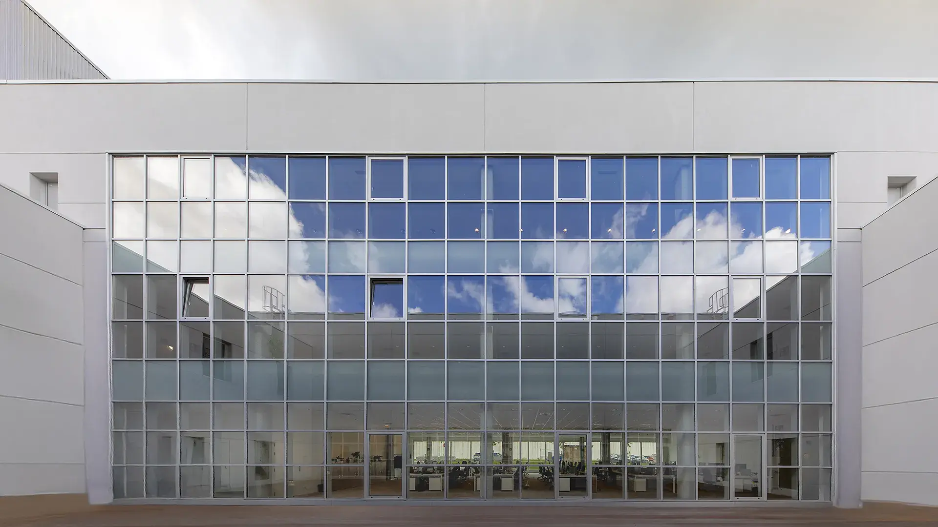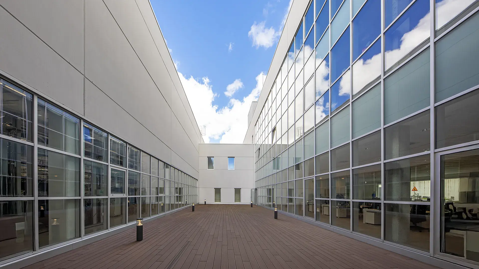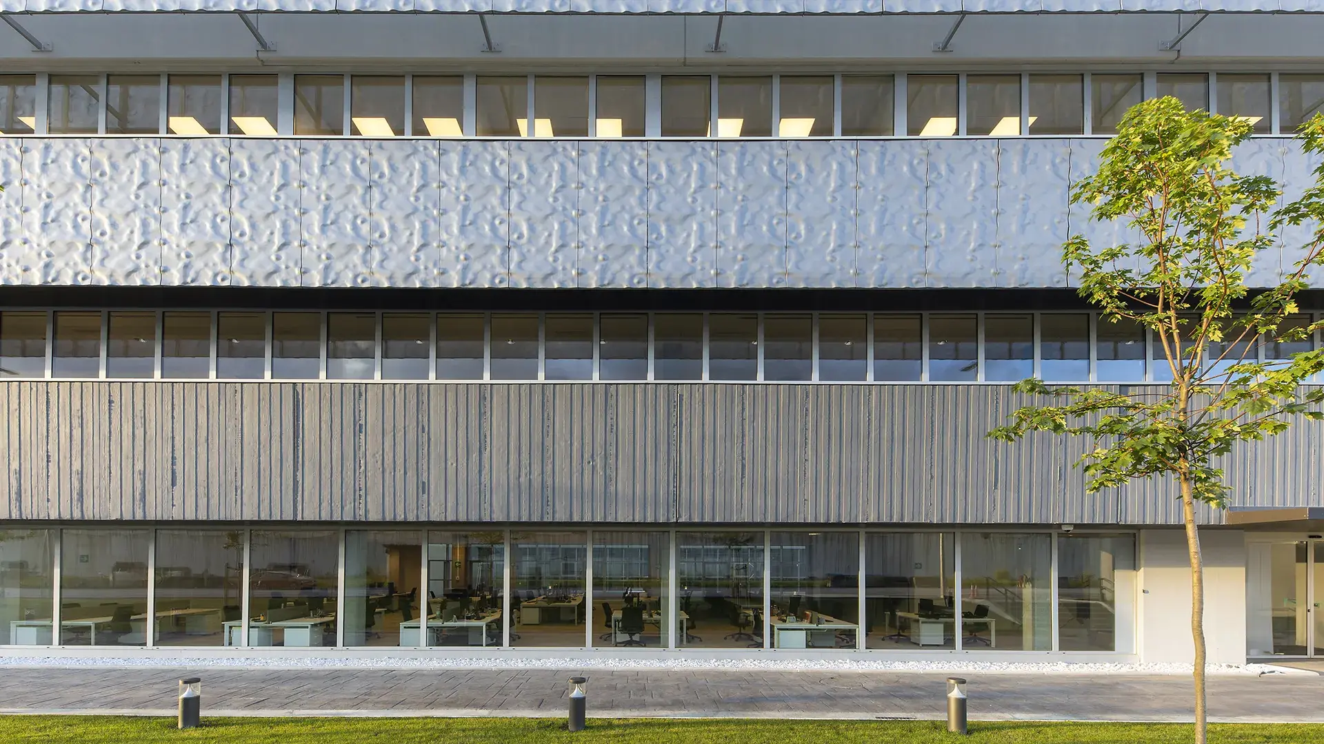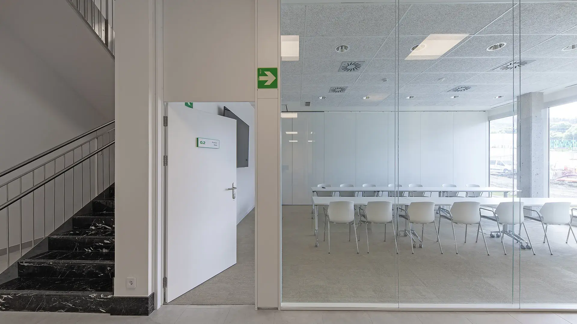 La comunicación entre oficinas y laboratorios se resuelve por medio de un patio interior abierto que proporciona iluminación y ventilación natural a la nave y sirve de espacio de desahogo para los investigadores, lo que, junto con las terrazas de planta segunda, dota al edificio de espacios reservados, compartidos y al aire libre, conformando un entorno de trabajo de calidad para sus usuarios.