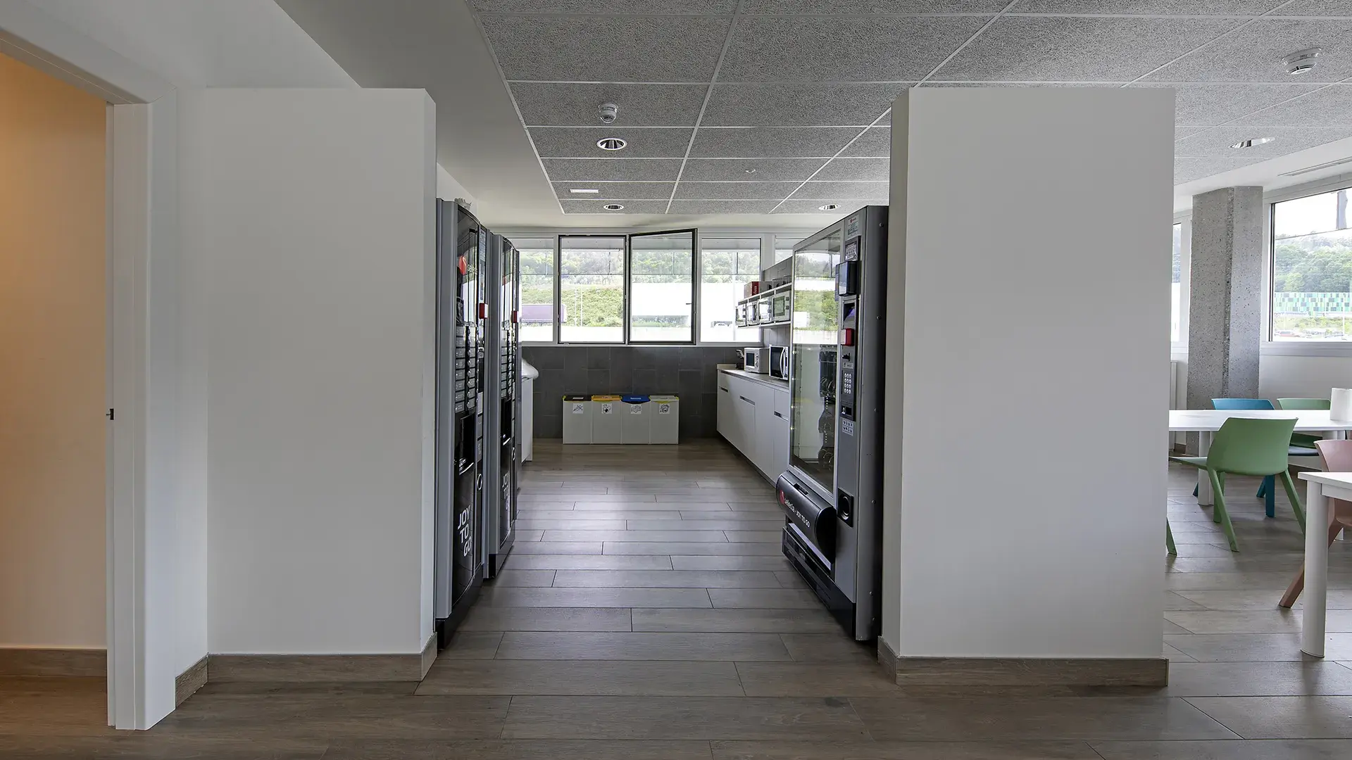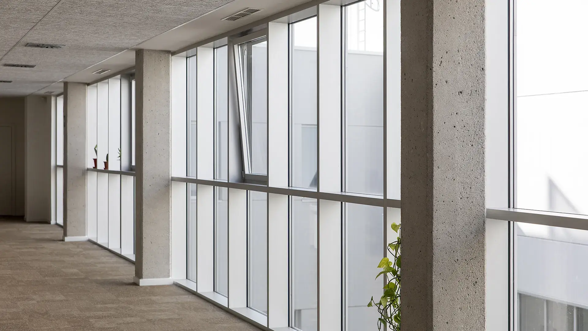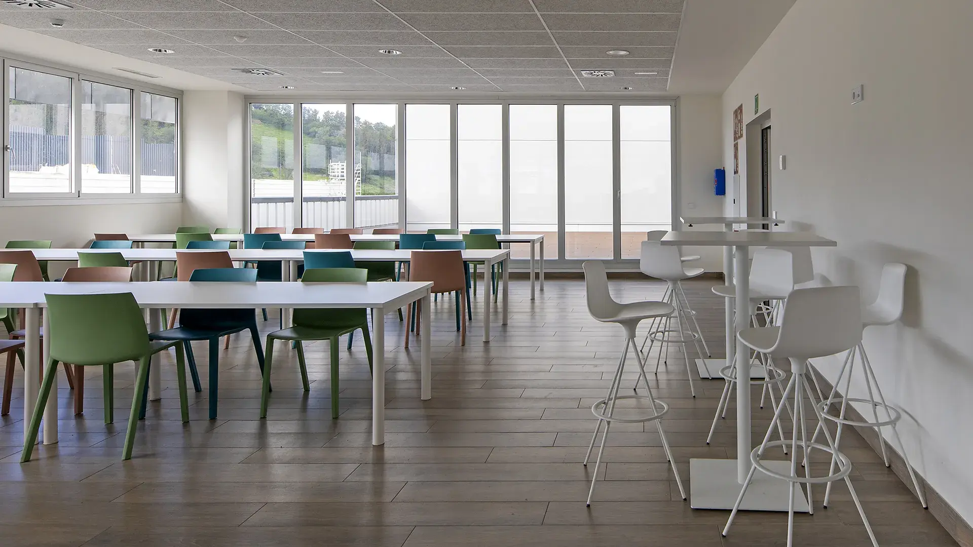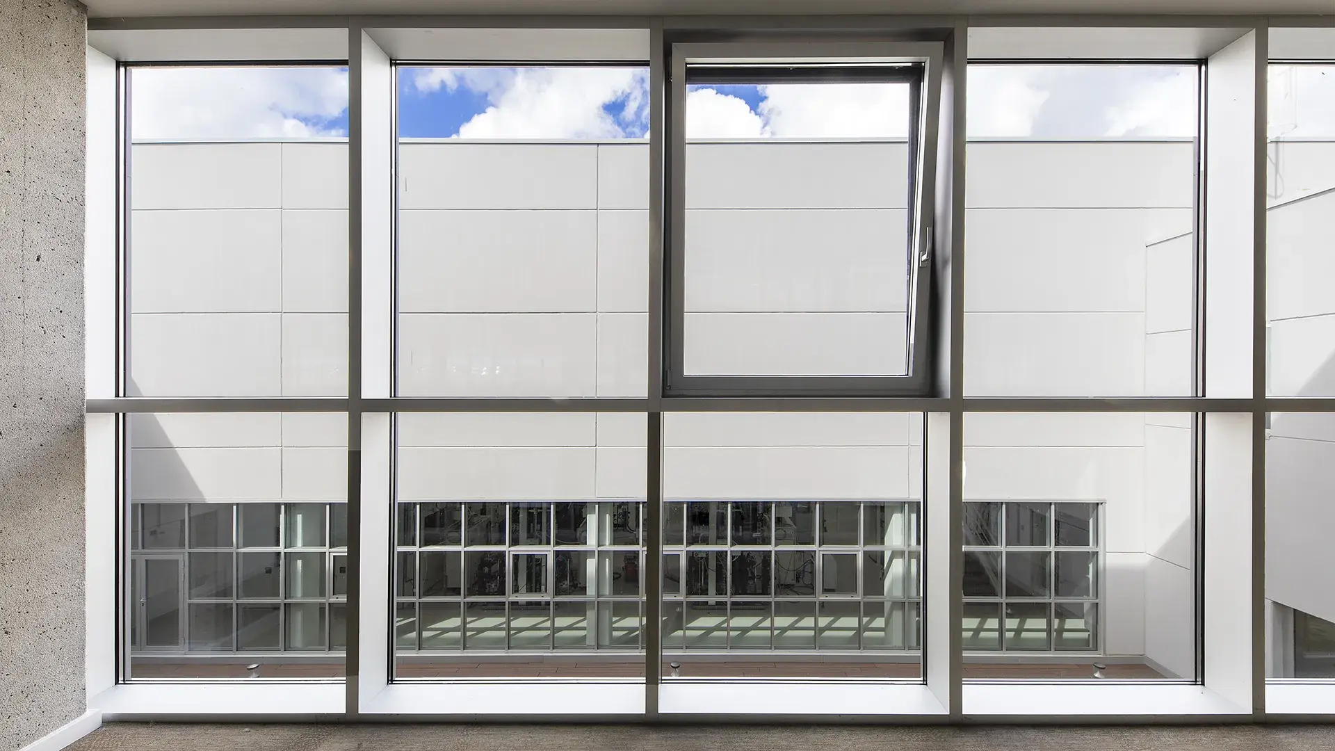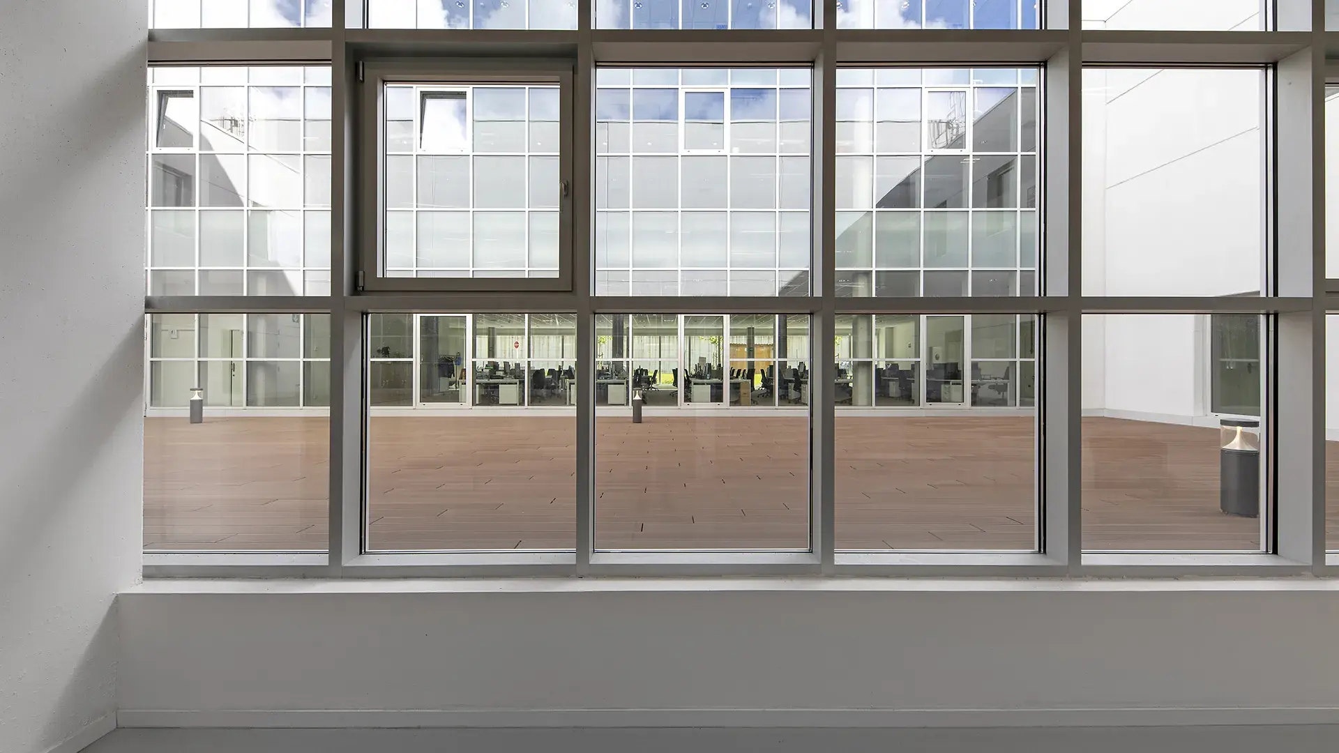 La comunicación entre oficinas y laboratorios se resuelve por medio de un patio interior abierto que proporciona iluminación y ventilación natural a la nave y sirve de espacio de desahogo para los investigadores, lo que, junto con las terrazas de planta segunda, dota al edificio de espacios reservados, compartidos y al aire libre, conformando un entorno de trabajo de calidad para sus usuarios.
