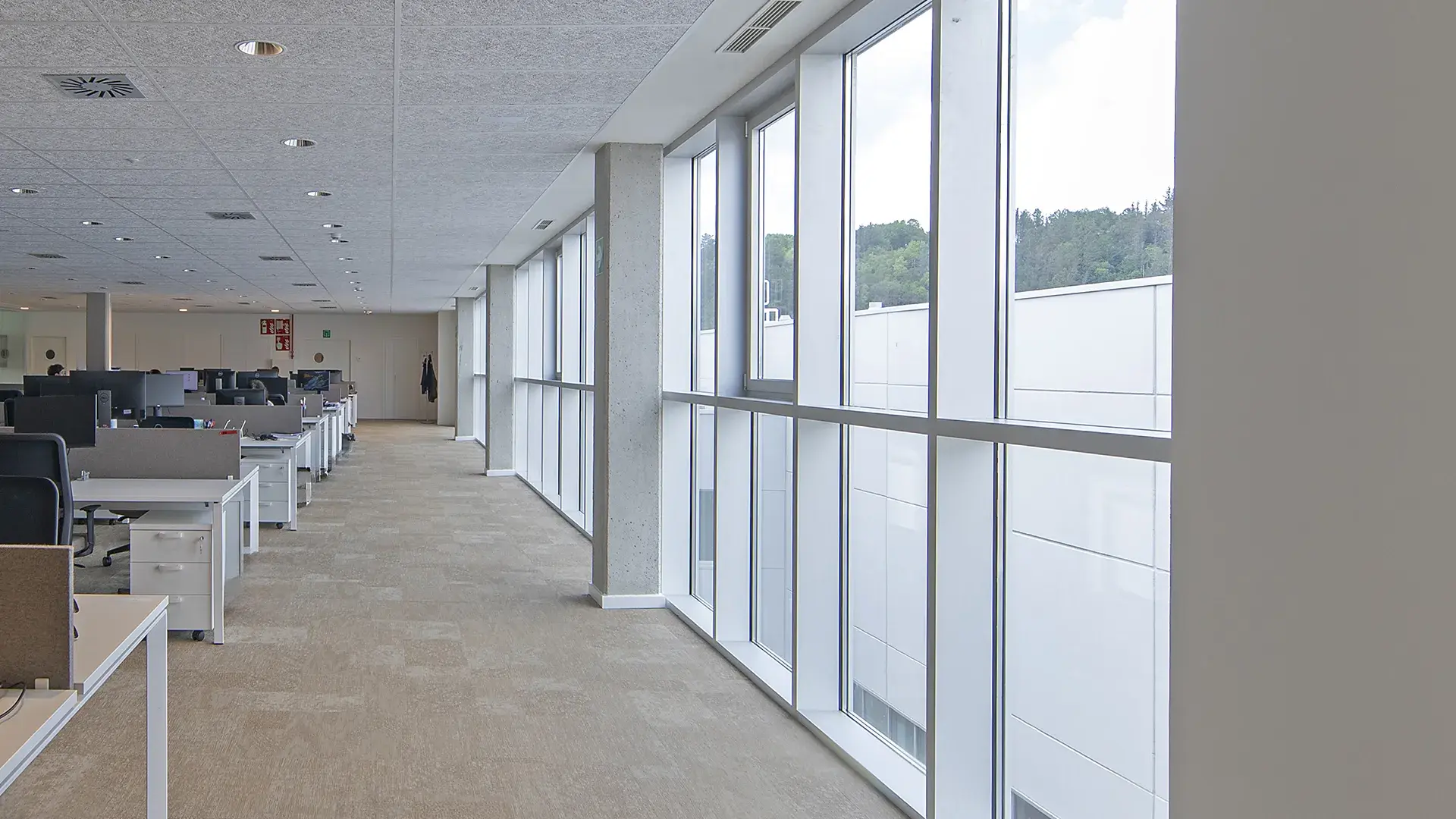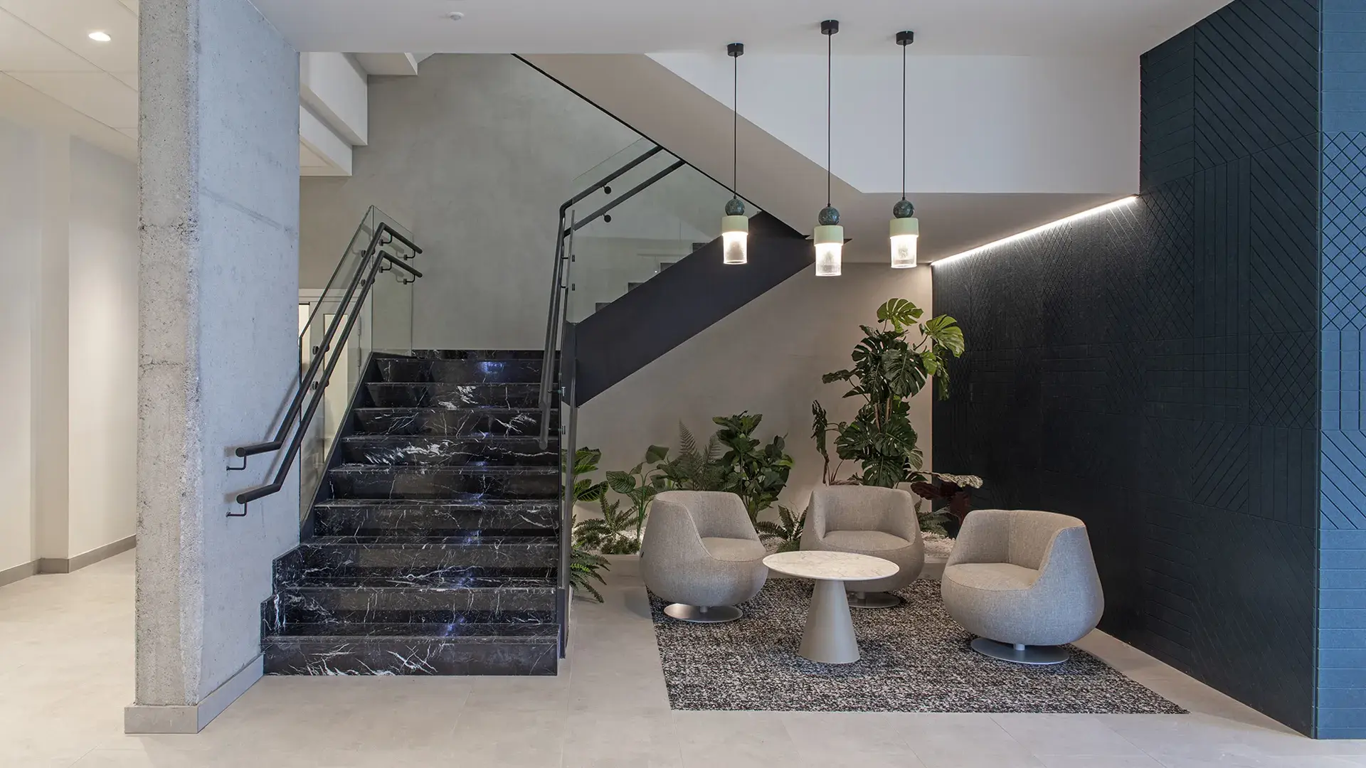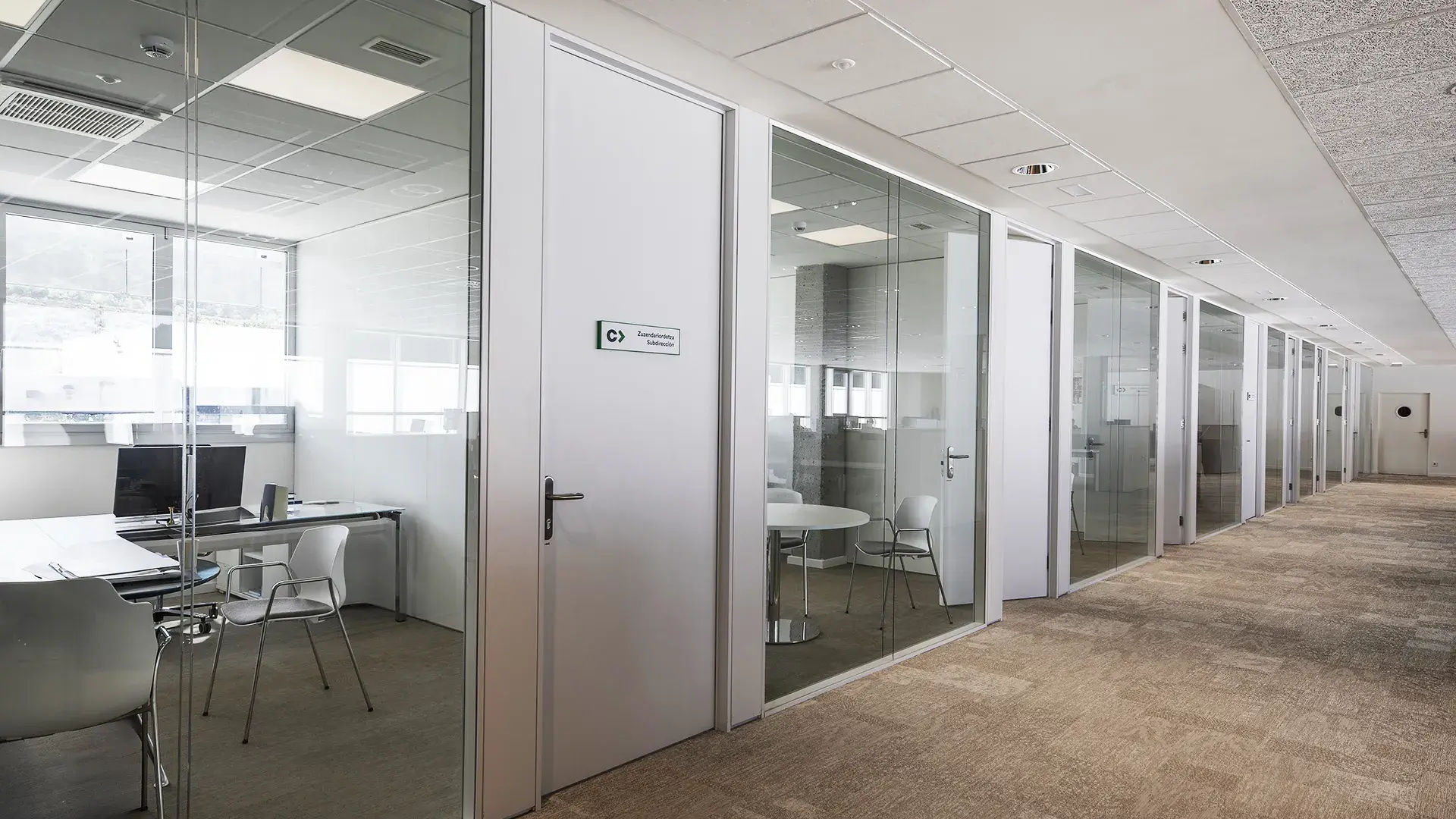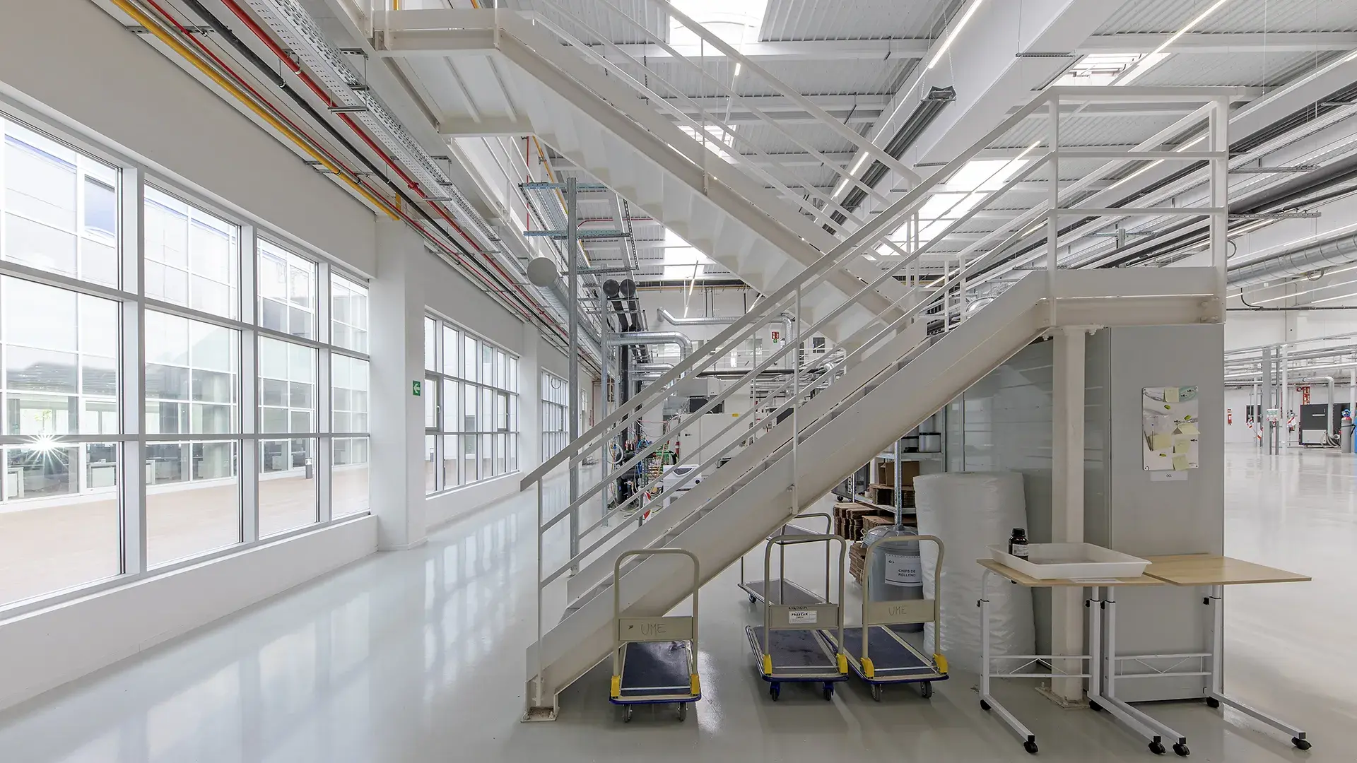 La comunicación entre oficinas y laboratorios se resuelve por medio de un patio interior abierto que proporciona iluminación y ventilación natural a la nave y sirve de espacio de desahogo para los investigadores, lo que, junto con las terrazas de planta segunda, dota al edificio de espacios reservados, compartidos y al aire libre, conformando un entorno de trabajo de calidad para sus usuarios.