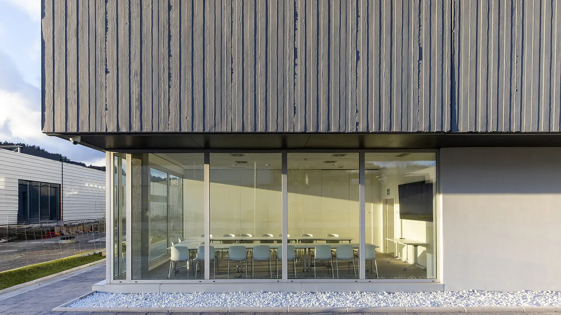 La construcción se ha realizado con estructura de hormigón in situ y prefabricada, aterrazando cada elemento y amoldándose al terreno y a las cotas de la urbanización. En el exterior, se han utilizado paneles de hormigón prefabricado, texturizados y pintados in situ en contraste con un velo de chapa de aluminio, abotonada y perforada en oficinas para su fachada principal, resultando un edificio sobrio y funcional que responde a las necesidades de Fundación CIDETEC.