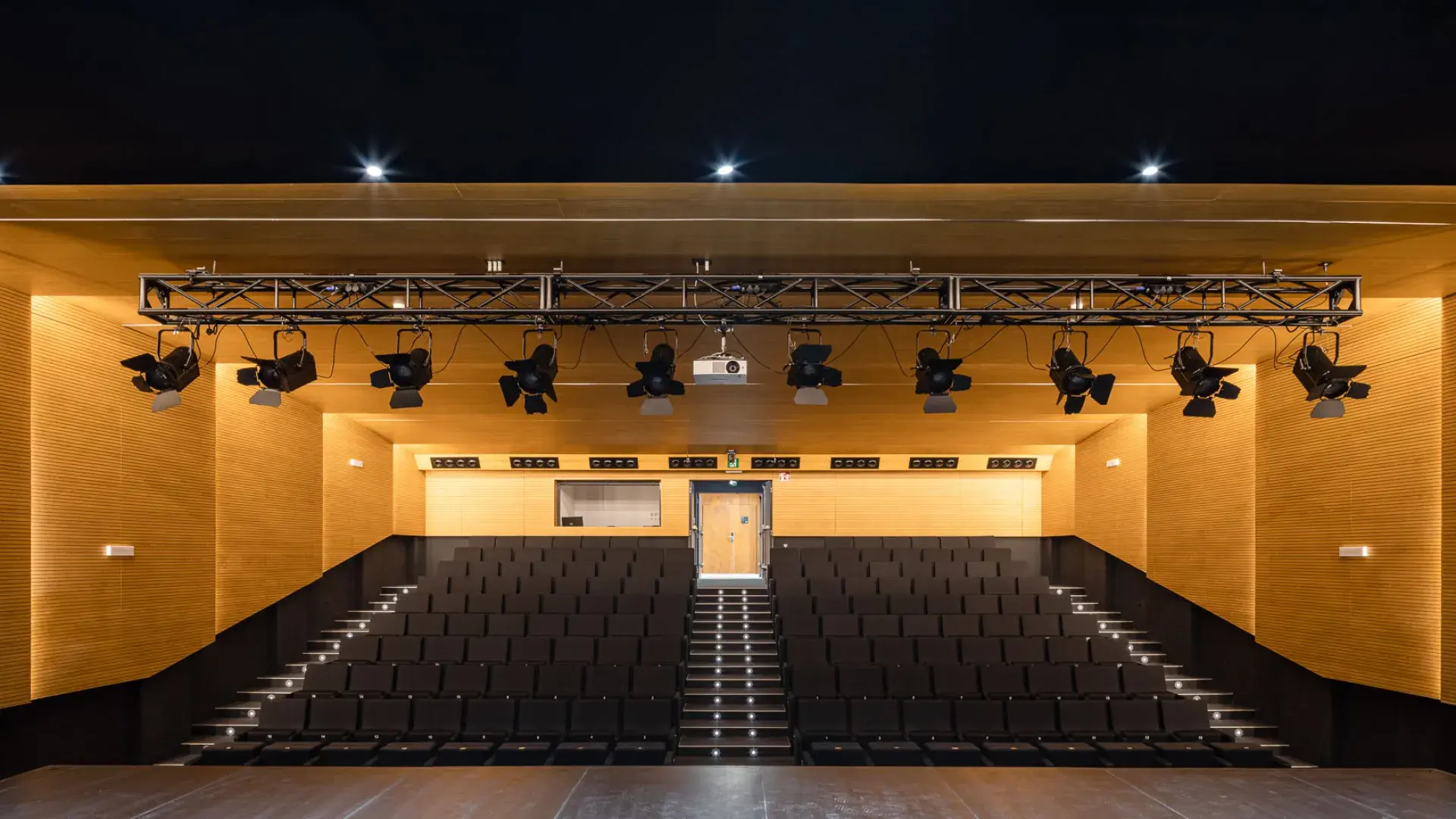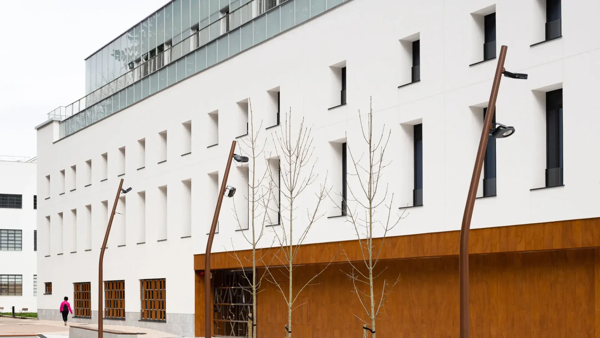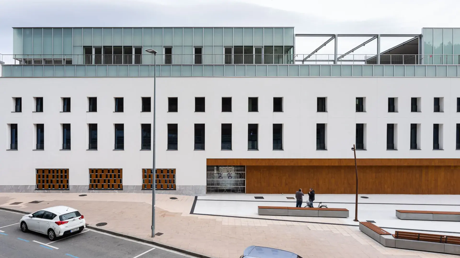 El auditorio, elemento destacado del programa, es la única pieza que irrumpe en el exterior alterando la composición y la materialidad de la fachada original, y contribuyendo a la expresividad del nuevo uso del edificio y a la configuración del acceso y la plaza exterior.
