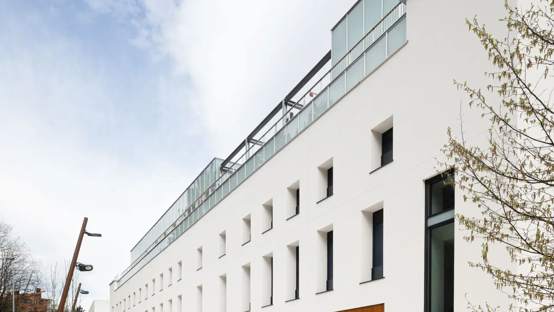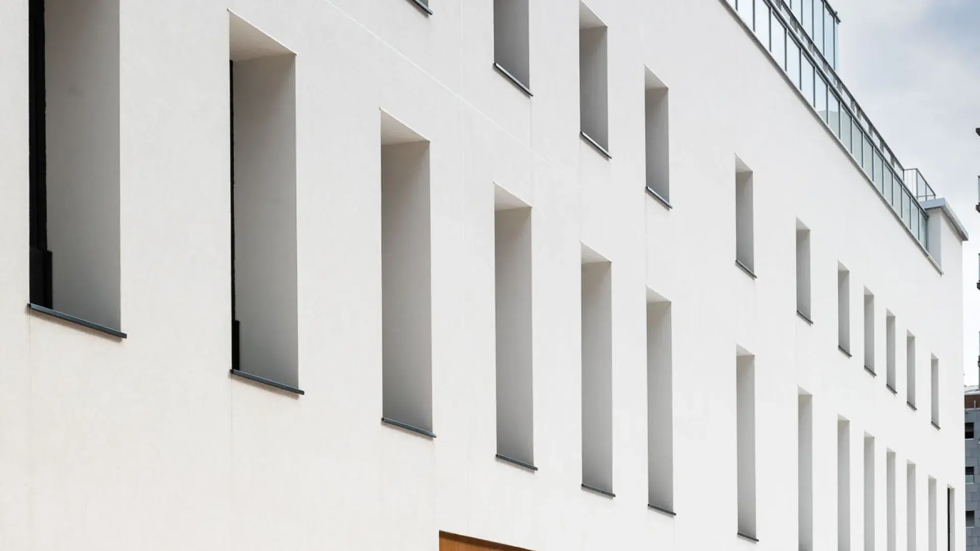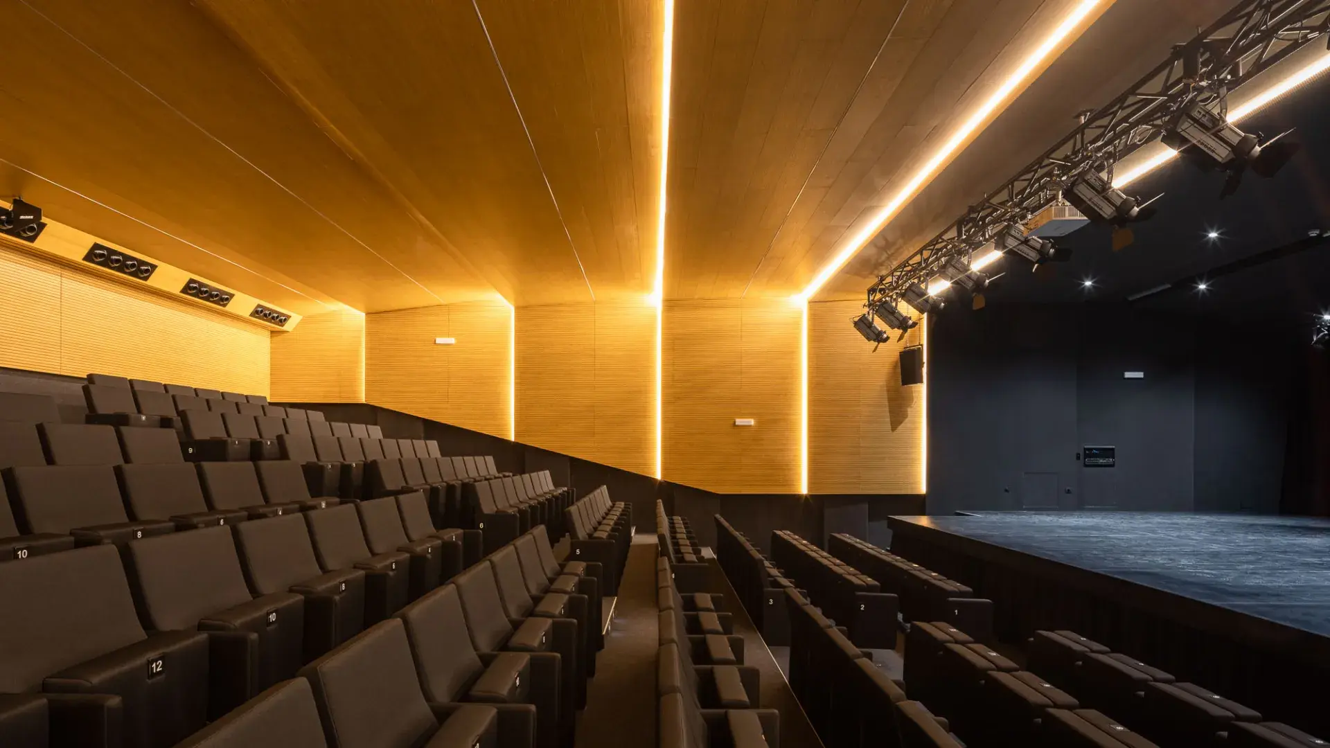 El auditorio, elemento destacado del programa, es la única pieza que irrumpe en el exterior alterando la composición y la materialidad de la fachada original, y contribuyendo a la expresividad del nuevo uso del edificio y a la configuración del acceso y la plaza exterior.