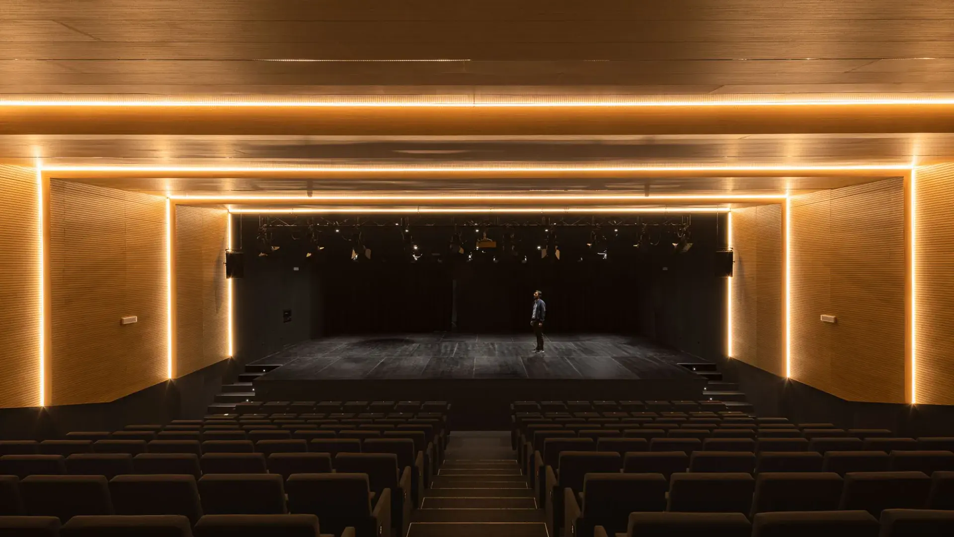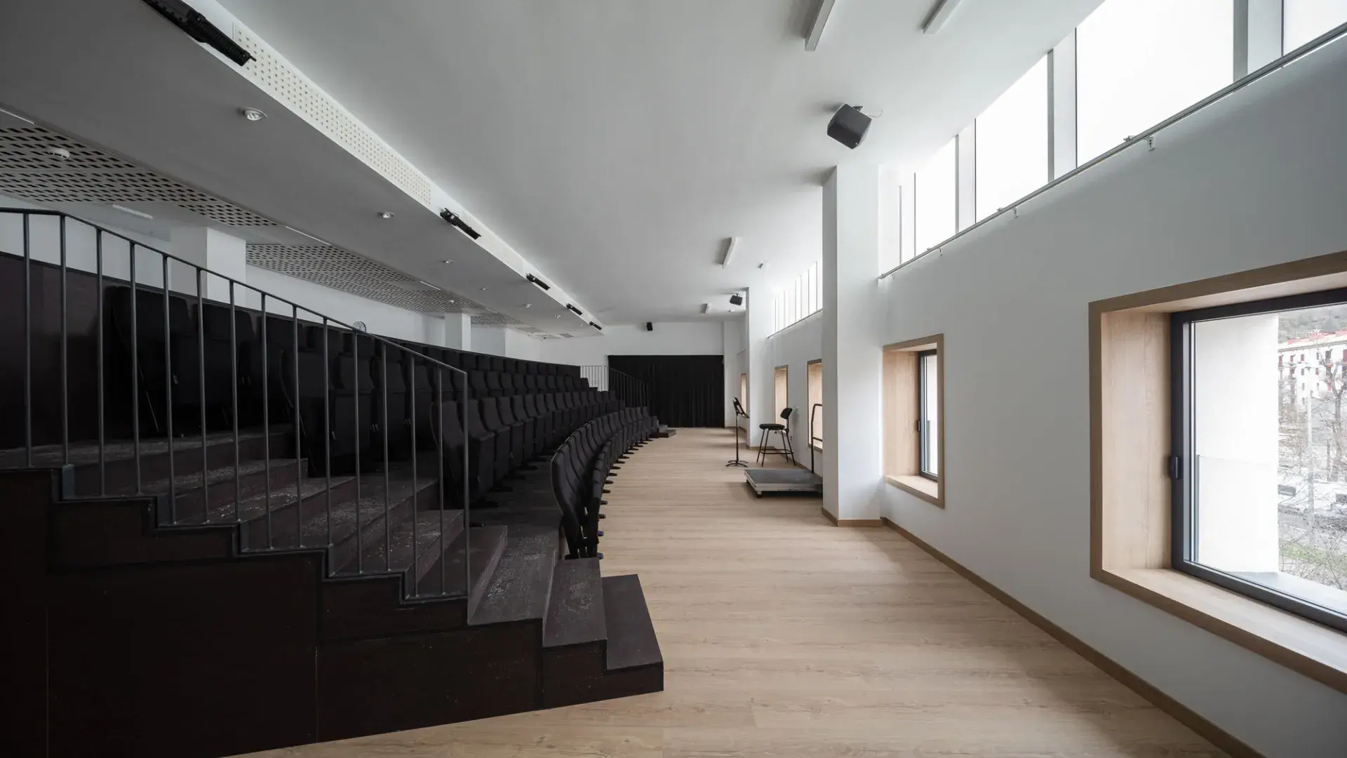 Una de las principales decisiones que adopta la propuesta es aumentar su altura en una planta, con el fin de responder a la totalidad de la superficie necesaria descrita en el programa, y preservar la rotundidad del paralelepípedo y la percepción del mismo desde los distintos puntos de vista. Esta planta tercera se retranquea con respecto a la línea principal de fachada y se diseña en vidrio y metal, buscando el contrapunto a la fachada muraria original, y aprovechando su comportamiento dinámico frente a la luz. En esta planta se sitúan aquellas estancias de menor exigencia acústica, como son las áreas de gestión y servicios, y la terraza multiusos.